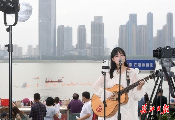 长江日报大武汉客户端7月16日讯(记者侯钰倩)万里长江横渡,极目楚天舒。7月16日上午,第48届武汉7·16渡江节鸣枪开赛。长江日报“可视电台”在武汉横渡长江博物馆一楼的渡&咖(江景店)唱响激爽渡江之夏,青年音乐人们用歌声为渡江健儿加油助威。