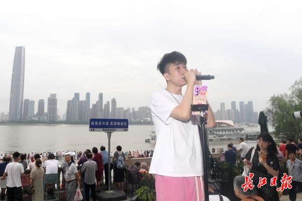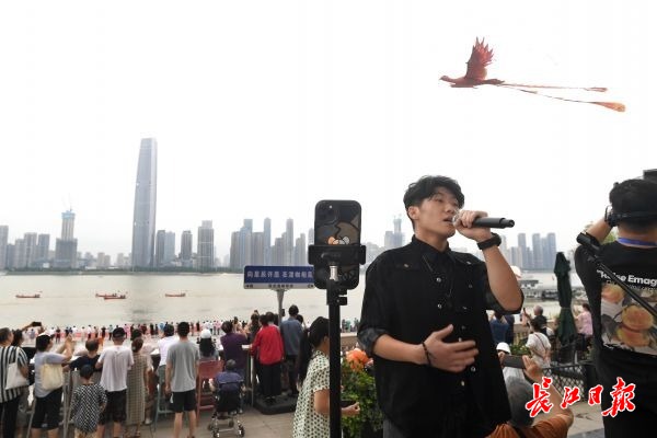 本场“可视电台”,直播间再次迎新。新声力量杨歌叶深情演绎《风吹麦浪》《奔跑》《水手》等歌曲。杨歌叶告诉记者,他从小喜欢唱歌,并从2019年开始专业学习。如今加入到武汉定格街唱团,他说:“在江边演唱,心境会随着风调动情感,更投入了。”直播现场,音乐博主柚子活力演唱《日不落》《第一天》,将现场的热情点燃。“可视电台”常驻歌手张骋以他极具故事感的声线,带来《夏天的风》。张骋说:“这是我为江边、夏天元素特地选择的歌曲,希望为炎炎夏日带来一丝清凉。”