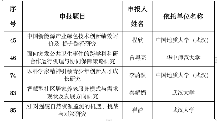 此次经组织专家形式审查和综合评审,共评选出120个项目,其中,重点资助项目和一般资助项目各30项,仅立项无资助经费项目60项。3所在汉高校共有5个项目入围,其中,中国地质大学(武汉)和武汉大学各2项,华中师范大学1项,具体名单如下: