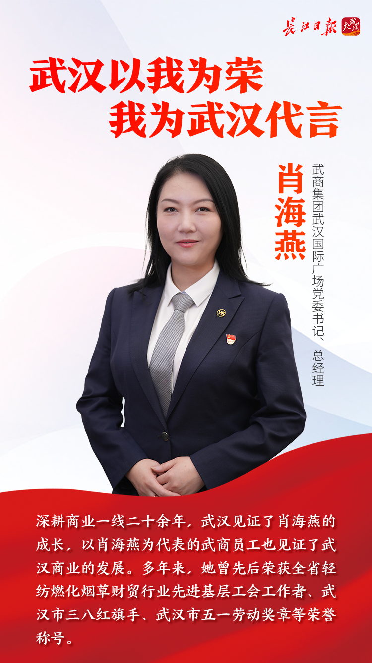 武汉以我为荣,我为武汉代言。深耕武汉商业一线二十余年,武汉见证了肖海燕的成长,以肖海燕为代表的武商员工也见证了武汉商业的发展。“未来我将带领团队不断进行消费焕新升级,丰富品牌影响力,多维度满足消费者对美好生活的向往,助力打造城市品牌、做优城市品质、提升城市品位,为武汉打造国际消费中心城市作出更大贡献。”肖海燕说。