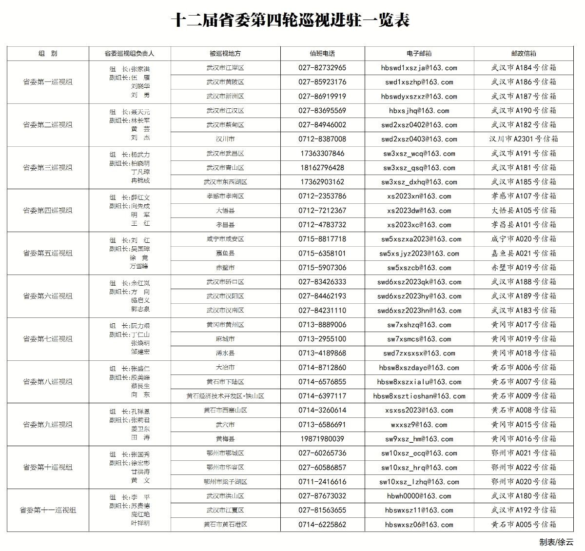 根据省委统一部署,本轮巡视将对武汉市江岸区、江汉区、硚口区、汉阳区、武昌区、青山区、洪山区、蔡甸区、江夏区、东西湖区、汉南区、黄陂区、新洲区;大冶市、黄石市黄石港区、西塞山区、下陆区、黄石经济技术开发区·铁山区;鄂州市鄂城区、华容区、梁子湖区;孝感市孝南区、汉川市、大悟县、孝昌县;黄冈市黄州区、麻城市、浠水县、武穴市、黄梅县;咸宁市咸安区、嘉鱼县、赤壁市共33个县(市、区)开展常规巡视,同步开展选人用人工作、落实意识形态工作责任制和巡察工作专项检查。