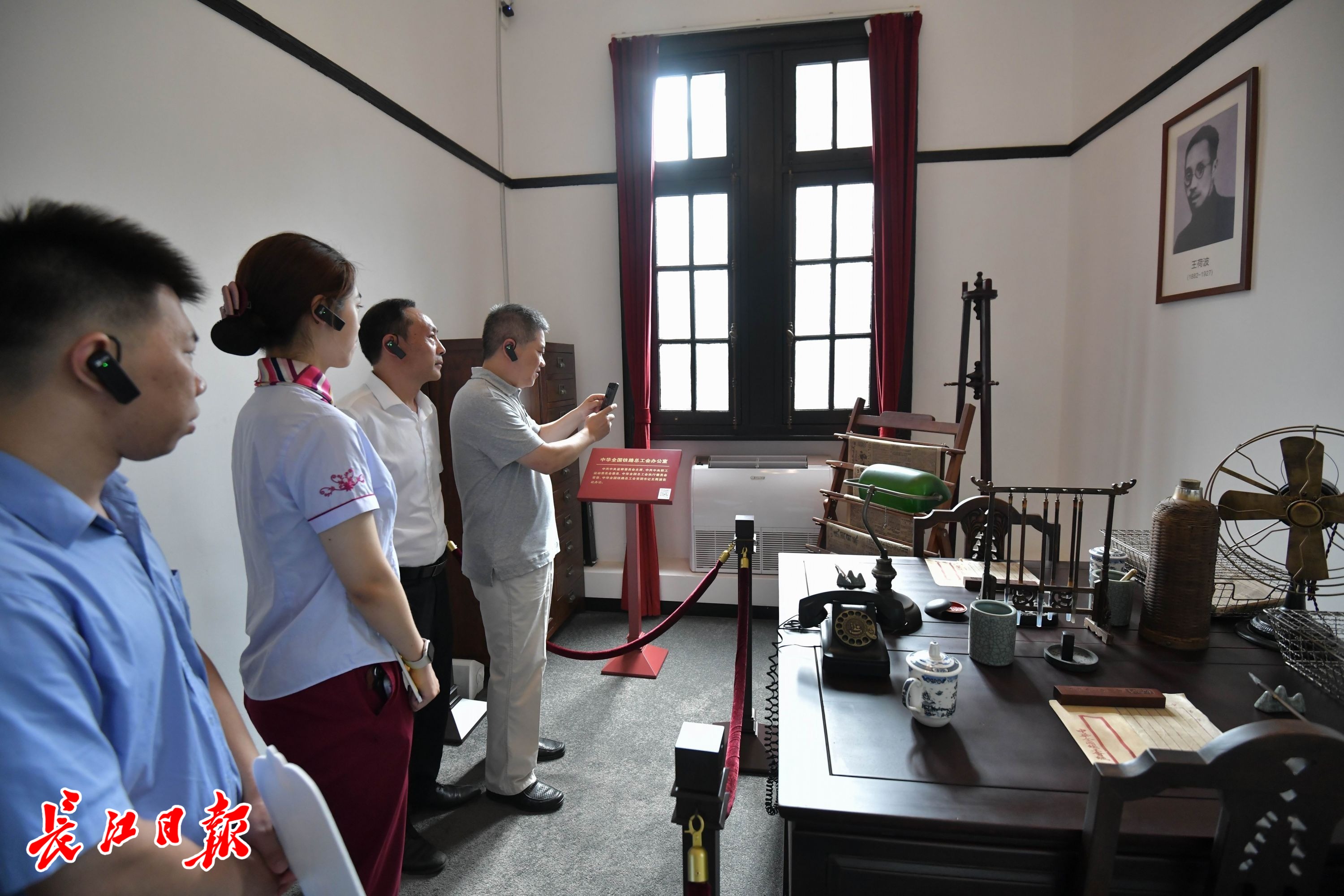 劳模工匠职工代表首站来到汉口中华全国总工会旧址纪念馆参观学习。“这里是中华全国铁路工会当年的办公室,王荷波曾在此办公。”讲解员带领大家参观一间办公室的复原陈列时介绍,1927年2月16日召开的中国铁路工会第四次代表大会,所有的筹备和会务工作均在这间办公室完成。大会上,王荷波当选为中华全国铁路总工会第四届执行委员会常委、中华全国铁路总工会党团书记。同年召开的中共五大选举产生党的历史上第一届中央监察委员会,王荷波、许白昊等工运领袖当选为中央监察委员会委员,杨培森、萧石月等工运领导人当选为候补监察委员,王荷波任中央监察委员会主席。