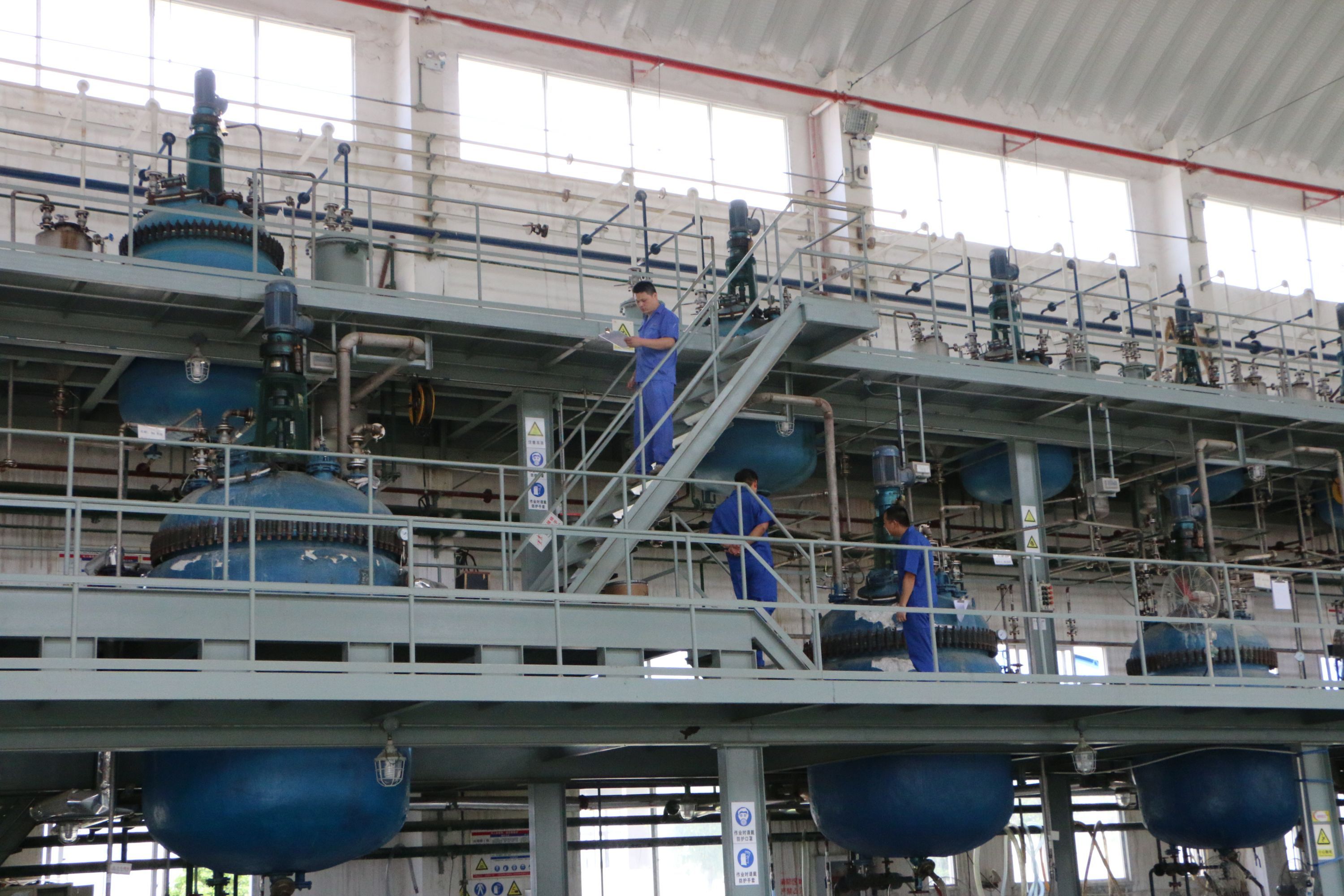 在迪赛新材生产车间里,工人们巡查机械的生产状态。