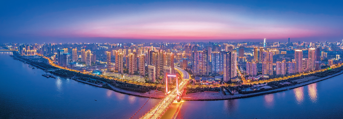 流光溢彩的汉阳江畔楼宇林立。籍鹏飞 摄
