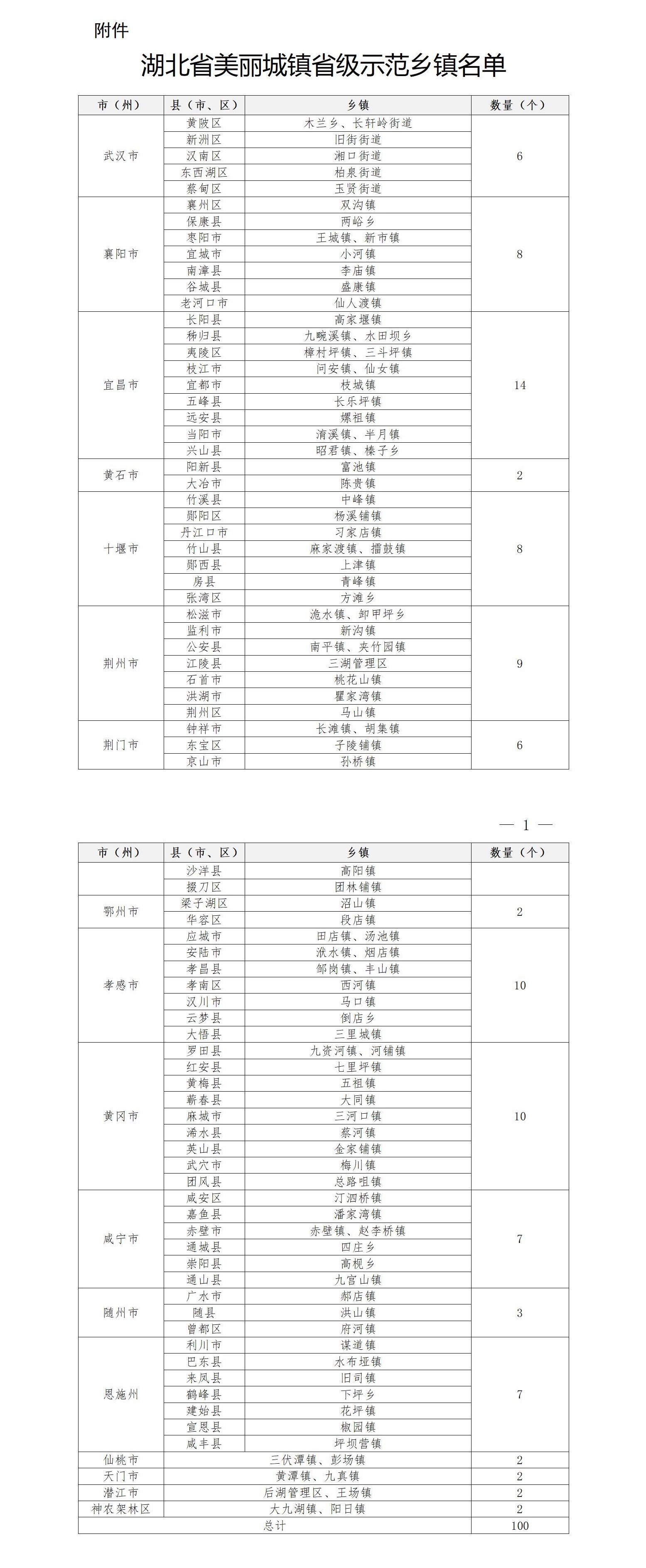 为贯彻落实省委省政府关于协调推进乡村振兴和新型城镇化战略部署,根据《湖北省“擦亮小城镇”建设美丽城镇三年行动实施方案(2020-2022年)》(鄂政办发〔2020〕54号),在全省开展了“美丽城镇省级示范乡镇”创建示范活动,经各地推荐、省级复核、社会公示、研究讨论,确定了武汉市黄陂区木兰乡等100个乡镇为全省美丽城镇省级示范乡镇,现予以公布。