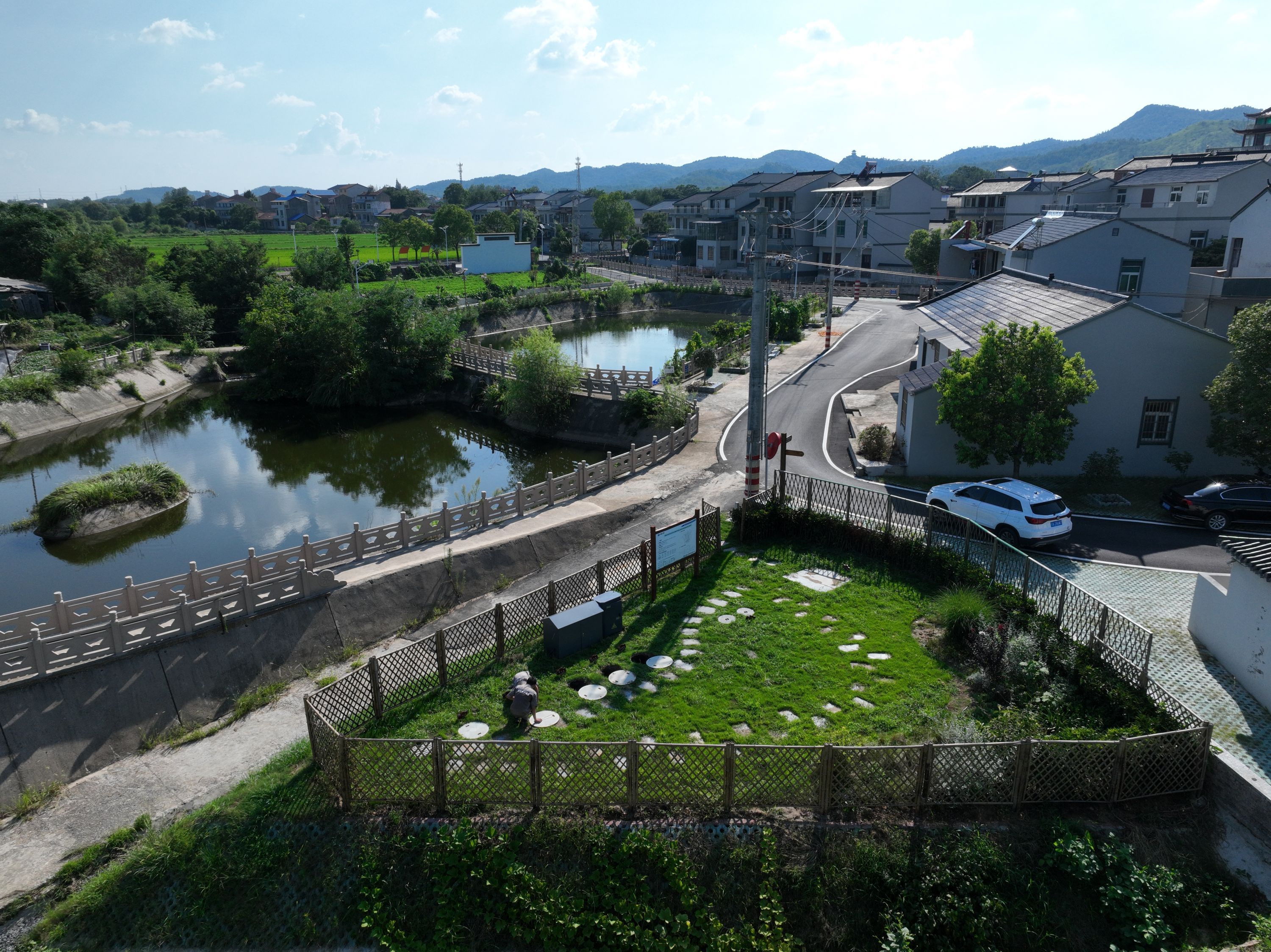 8月2日,身穿工作服的运维人员来到黄陂区双墩村陈李湾一处集中式污水处理站,轻车熟路地掀开井盖,查看里边的设施运行状况、出水水质。村湾里水清岸绿,一派美丽乡村景象。