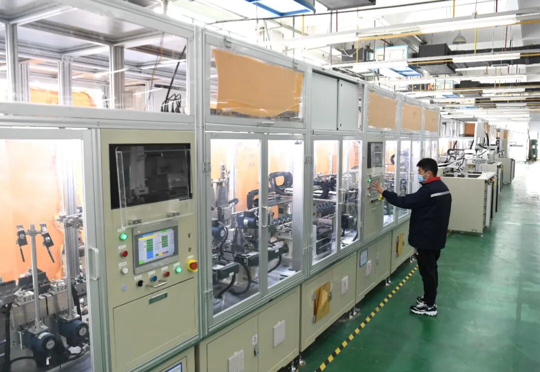 武汉逸飞激光股份有限公司技术人员在操作自主研发的全极耳电池生产线。记者高勇 摄