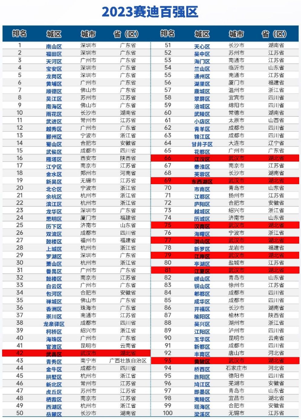 从入榜的8个城区来看,武昌、江汉、汉南、洪山、江岸、江夏均实现名次进位,汉南区进位幅度最大,从81名进入到75名。