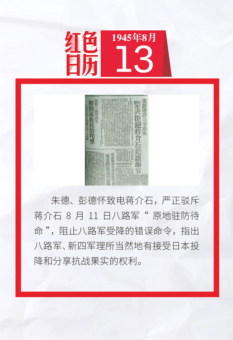1945年的今天,朱德、彭德怀严正驳斥蒋介石阻止八路军受降的错误命令|红色日历