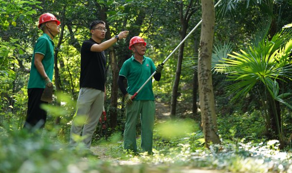 王臻(左二)与园林工人巡护蛇山北坡。李子云 摄