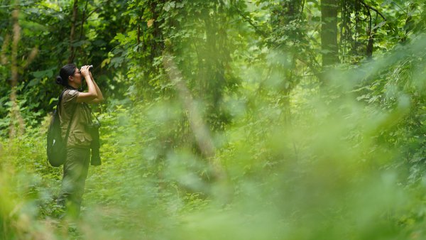 郝丽娟在“魔术林”观鸟。李子云 摄
