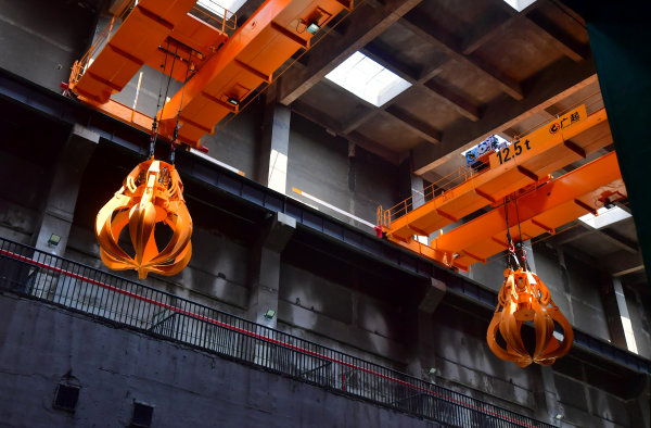 有机质固废处理厂厨余卸料口桁车抓斗。
