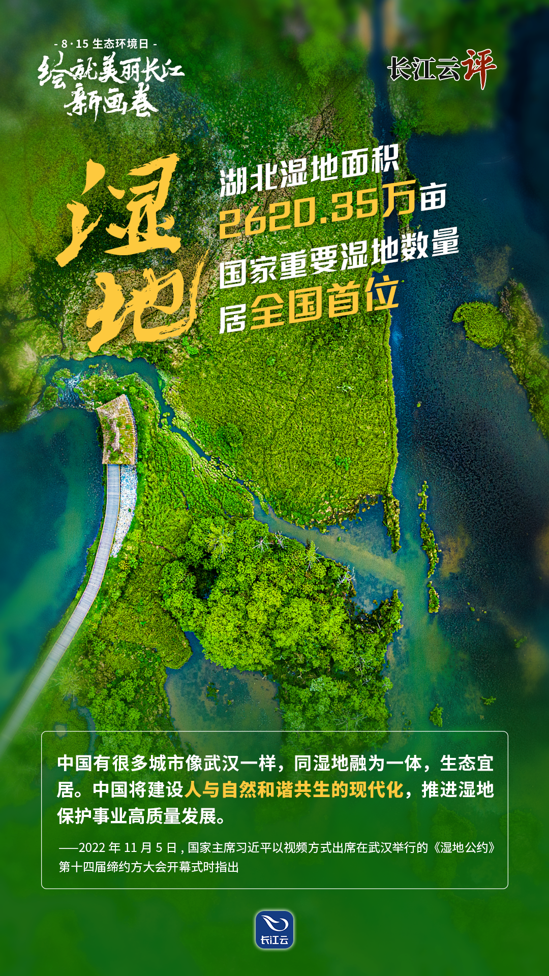 灵秀湖北草丰美,大美湿地鸟翔集。烟波浩渺的郧阳湖、水清岸绿的府河畔、满眼翠色龙感湖、峰影倒映的网湖……湖北省推进湿地保护与修复落地见效,“山水人城和谐相融”、绿意空间全民共享的湿地画卷尽情舒展。千湖之省奏响“诗地”乐章,着力守护家门口的“诗与远方”,让人民在湖光碧色中共享自然之美、生活之美。