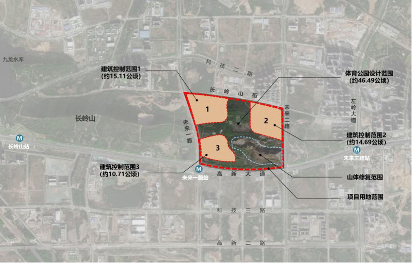 武汉新城体育中心南临高新大道、西临未来一路、北临长岭山街、东临未来二路,计容总面积约为10万平方米,主要包含综合体育场馆、全民健身中心、运营服务中心及配套运营用房等。
