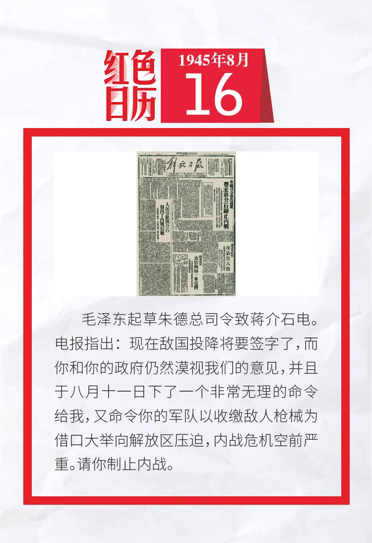 1945年的今天,毛泽东起草朱德总司令致蒋介石电,请他制止内战|红色日历