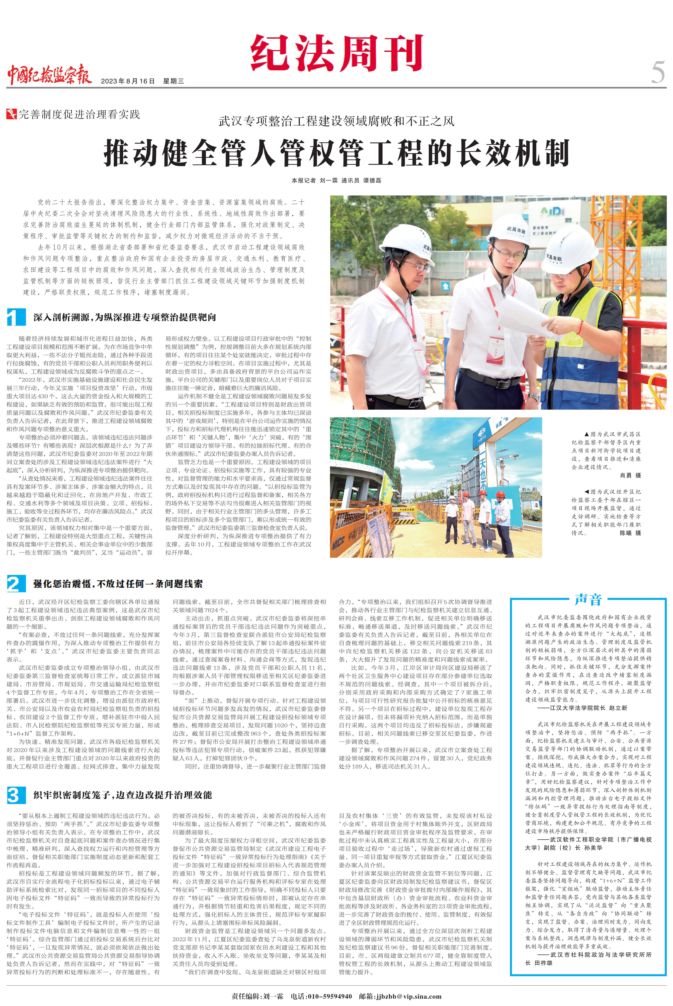 长江日报大武汉客户端8月16日讯(记者谭德磊 通讯员张易博)8月16日,《中国纪检监察报》纪法周刊栏目以“武汉专项整治工程建设领域腐败和不正之风 推动健全管人管权管工程的长效机制”为题,专题报道武汉开展工程建设领域腐败和作风问题专项整治工作经验及治理成效。