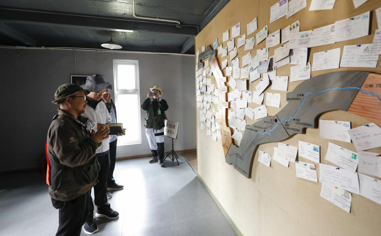 2023年7月24日,保护站工作人员张锡荣(左一)为“沿着长江读懂中国——万里长江行”探访团成员介绍公益墙,志愿者吴金华在一旁拍摄工作照片(右一)。王筝 摄