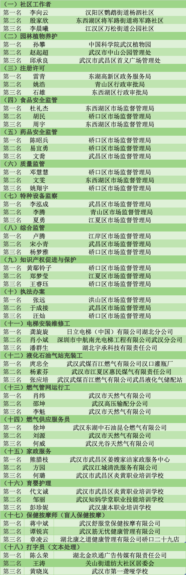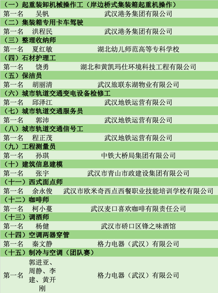 其中,市级一类大赛第1—3名选手和市级二类大赛第1名选手由市人社局授予“2022年‘武汉工匠杯’职业技能大赛技术能手”荣誉称号。具体名单如下: