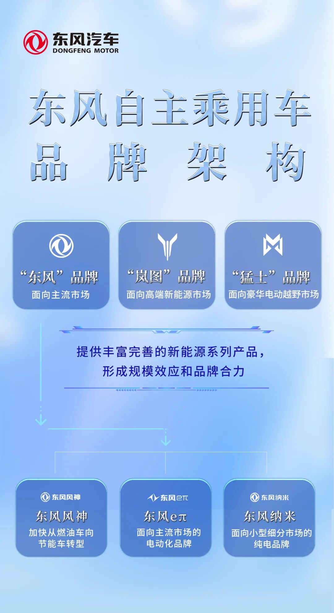 东风公司将成立东风乘用车销售有限公司和东风乘用车制造总部,一体化管理“东风”品牌下的东风风神、东风eπ、东风纳米三大产品系列品牌的营销、制造工作。同时,将三个产品品牌的商品企划与项目管理集中在集团统一管理,实现商企集中、制造集中、营销集中。三大产品系列品牌定位进一步明晰,东风风神将加快从燃油车向节能车转型,东风eπ定位为面向主流市场的电动化品牌,东风纳米为面向小型细分市场的纯电品牌并将于8月23日正式发布。东风风神、东风eπ、东风纳米三大产品系列品牌将承接“品质 智慧 和悦” 和“让汽车驱动梦想”的东风母品牌理念,同时保留差异化定位协同发展,共同做强做优做大“东风”品牌。至此,东风在乘用车领域形成面向豪华电动越野市场的“猛士”品牌、面向高端新能源市场的“岚图”品牌,以及面向主流市场的“东风”品牌的全新品牌格局,为客户提供丰富完善的新能源系列产品,形成规模效应和品牌合力。