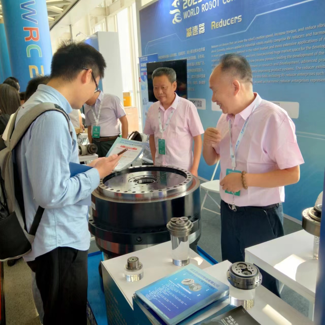 余运清(右一)向机器人行业上下游厂商介绍全球载重量最大的RV减速机情况。