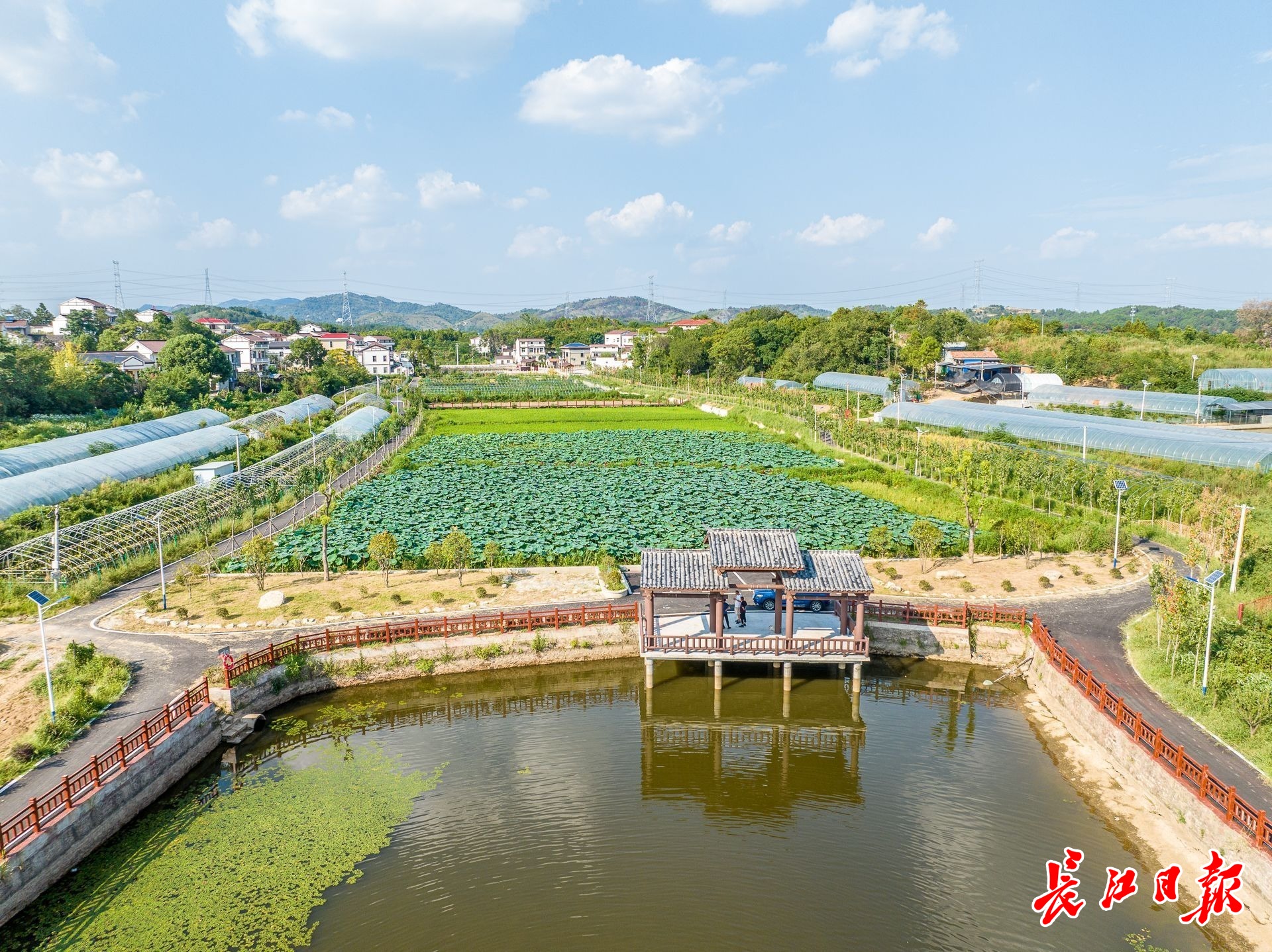 8月15日,长江日报记者在青云村博沿熊湾看到的,是一幅由稻田、荷田、鱼塘组成的美丽图景。微风吹拂下,荷叶与相邻的稻叶一起轻摇曼舞。方便拍照打卡的稻田栈道、可供依靠垂钓的围栏、游人漫步的沥青步道,还有可供驻足休憩的亭廊均已建成投用。而一年前,这里还是一片被尘土路围绕的淤泥田。