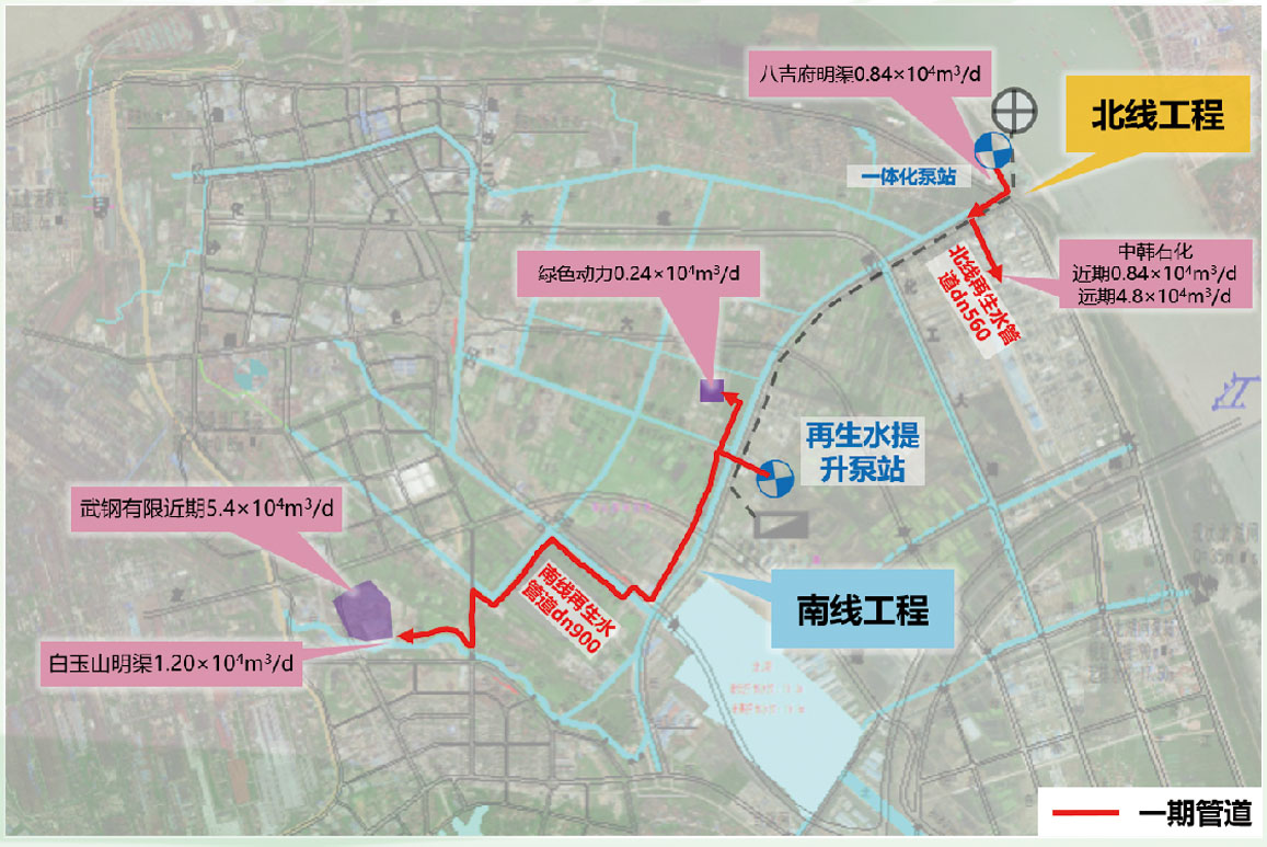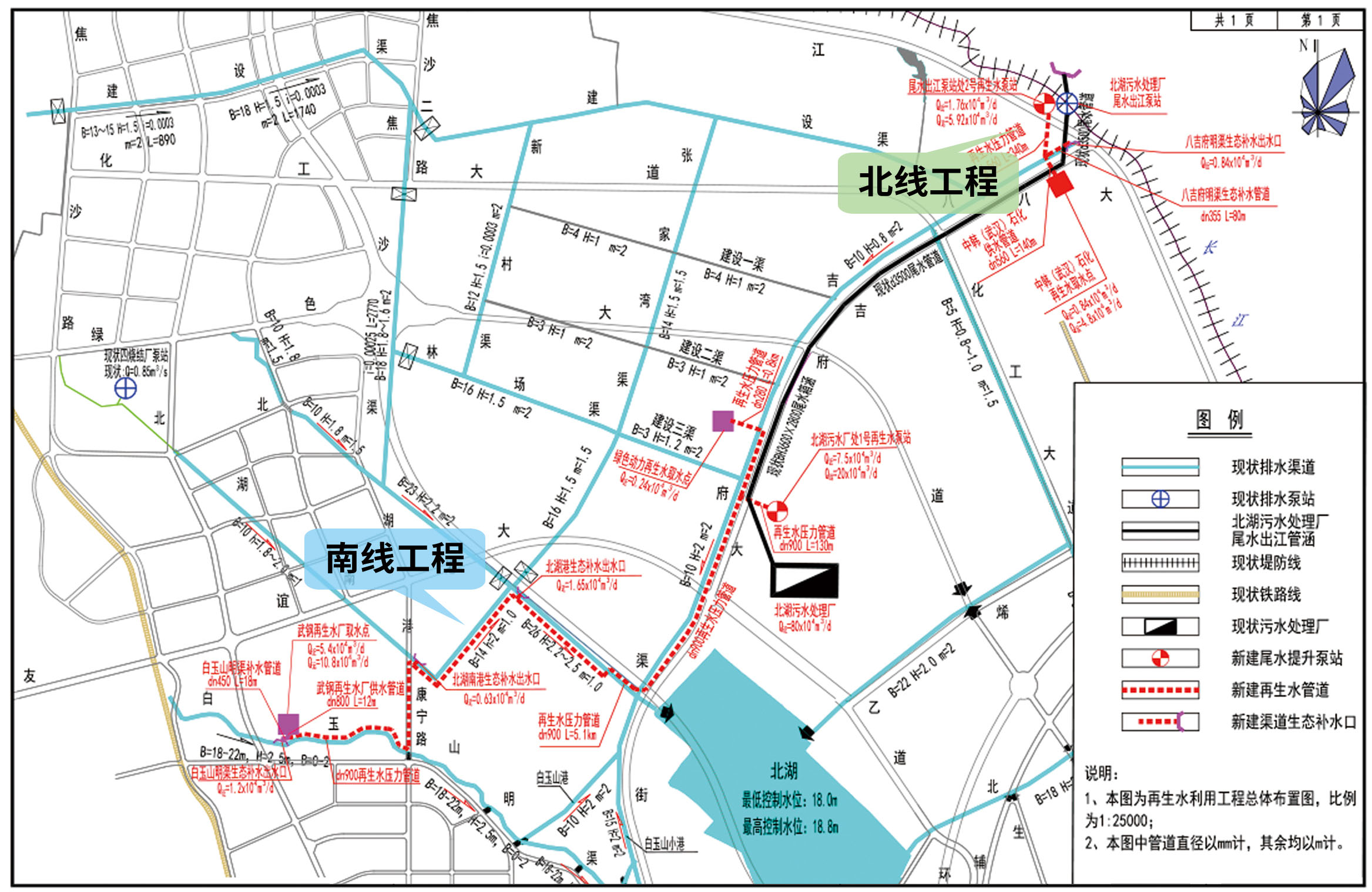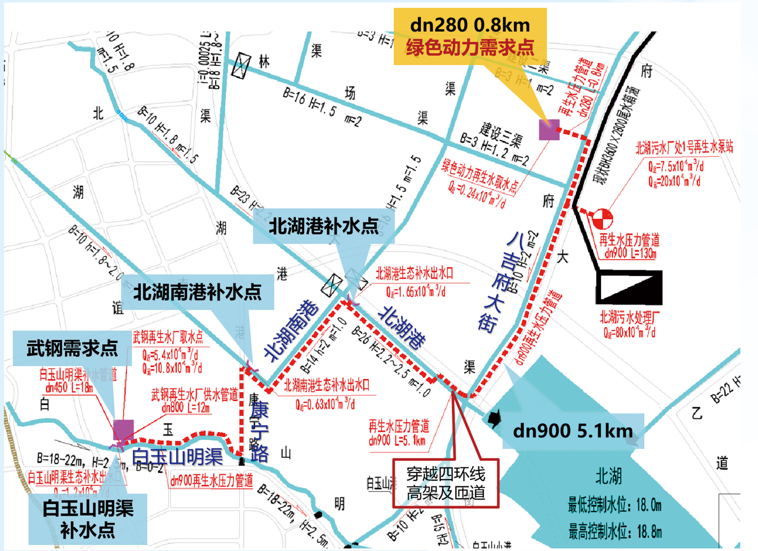 “项目设计因地制宜,让再生水直通直达需求端。”该项目相关负责人介绍,项目分为南、北两段,南线工程将在北湖污水处理厂内新建提升泵站一座,将尾水输送至武钢有限、绿色动力及白玉山明渠补水点;北线工程在尾水出江泵站处新建一体化泵站一座,将尾水输送至中韩(武汉)石化及八吉府明渠补水点。南北两线总共建设6.6公里地下压力管道,实现再生水不间断送达。