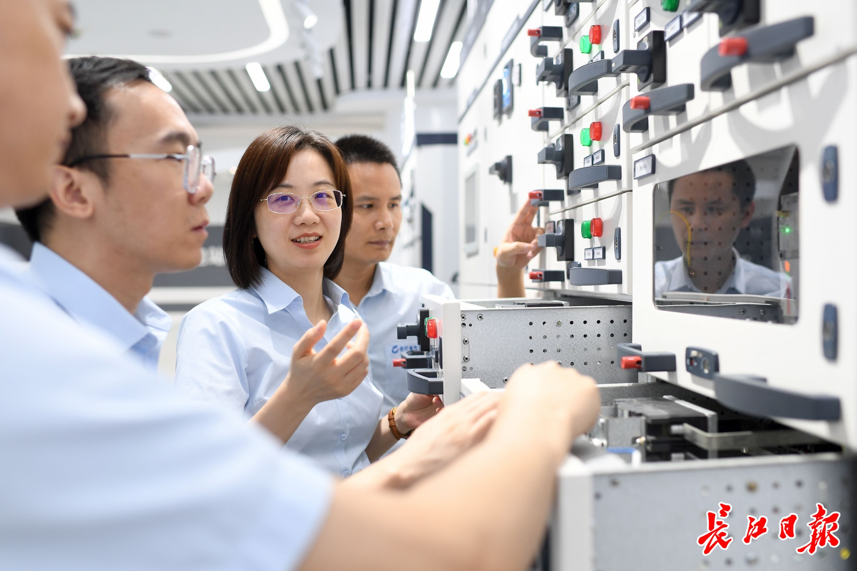 23日,长江电气新产品研发中心科研人员讨论研究智能配电解决方案的新工艺。长江日报记者周超 摄