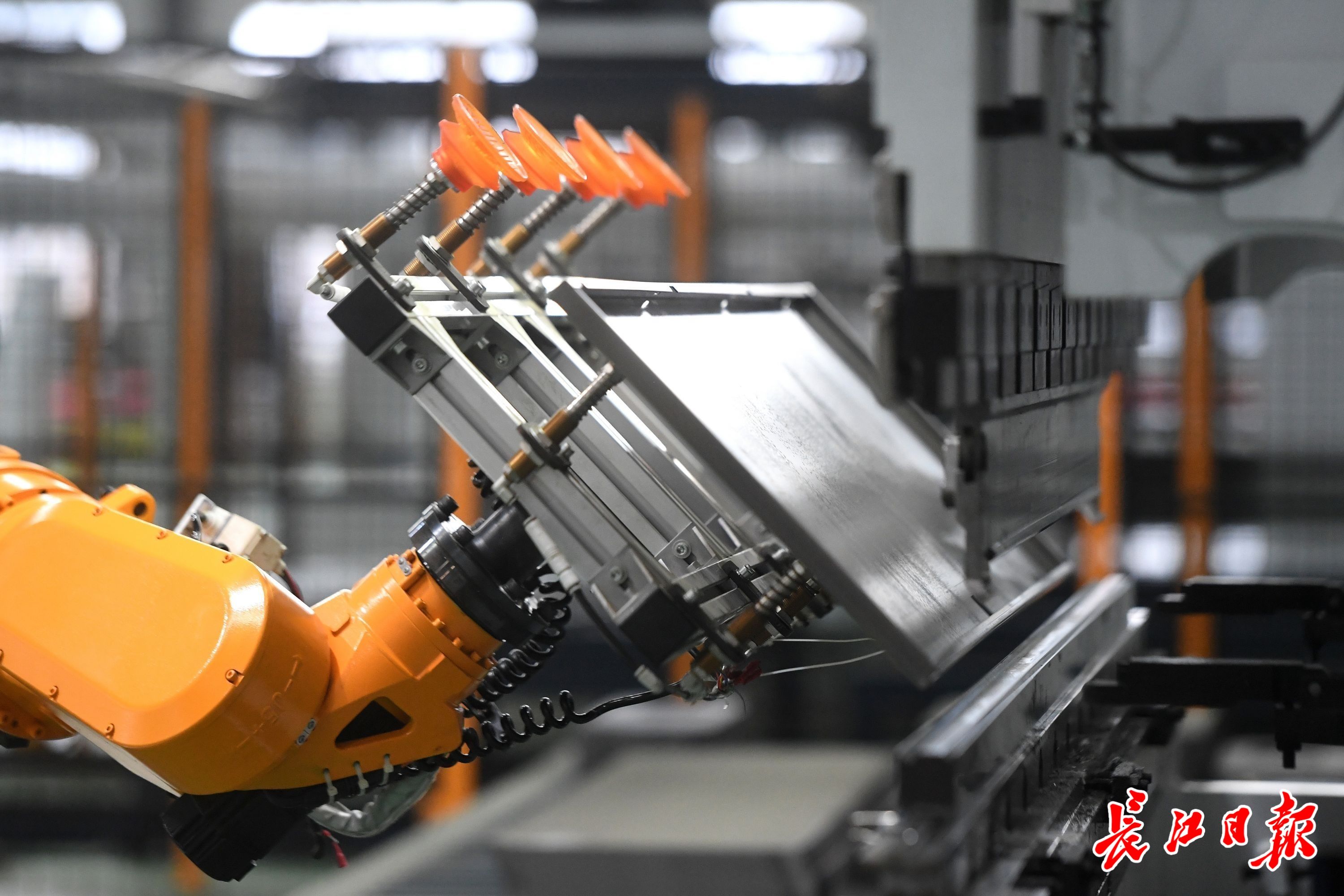 23日,长江电气数字化智造中心自动化生产线正在有序运转,伴随着工业机器人手臂的腾挪翻转,一件件配电柜金属件制作成型。长江日报记者周超 摄