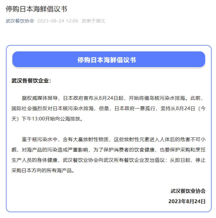 8月24日中午,武汉餐饮业协会官方微信公众号发文表示,鉴于核污染水中含有大量放射性物质,这些放射性元素进入人体后的危害不可小觑,对海产品的污染造成严重影响,为了保护消费者的饮食健康,也要保护采购和烹饪生产人员的身体健康,“武汉餐饮业协会向武汉所有餐饮企业发出倡议:从即日起,停止采购日本方向的所有海产品。”