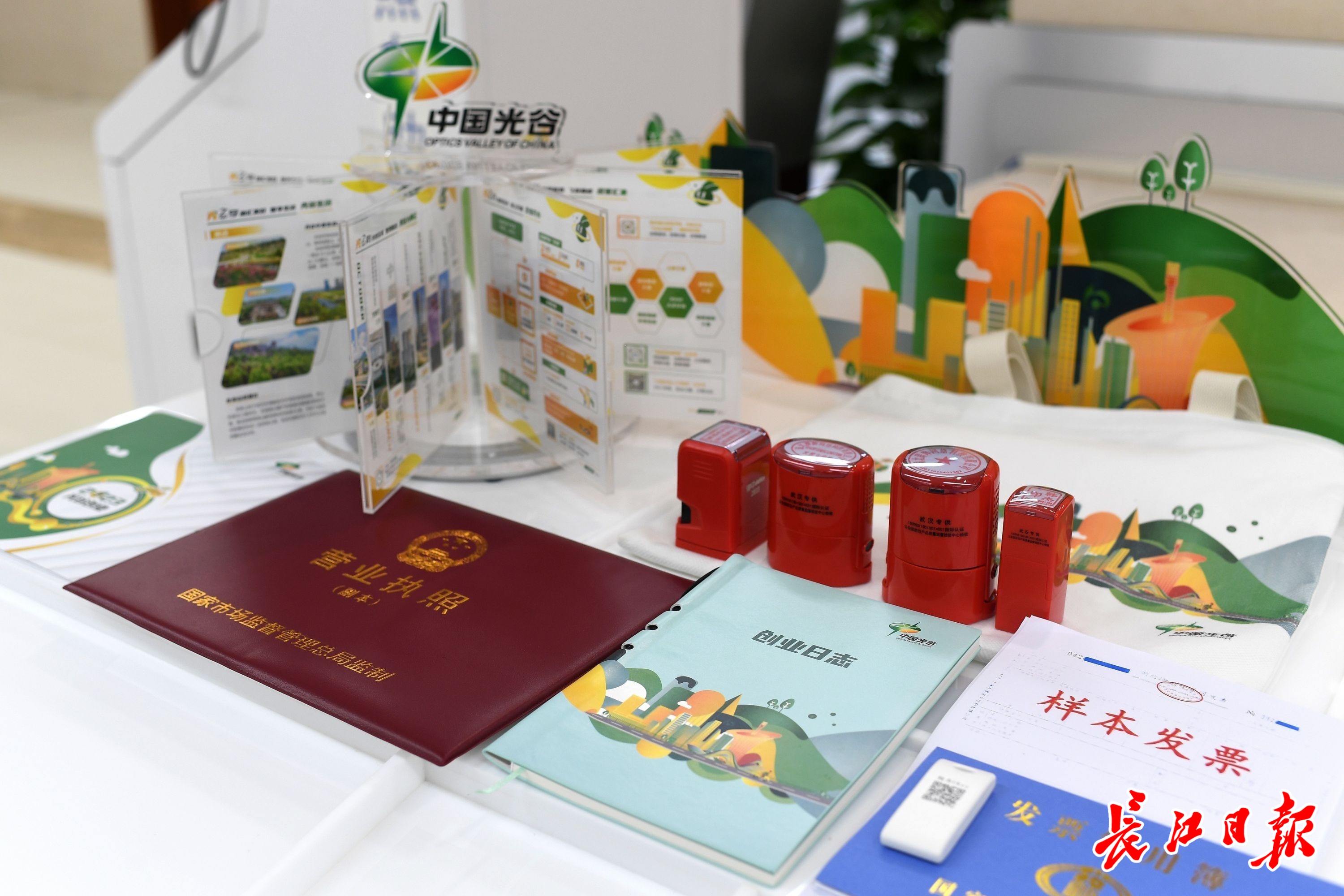 当日,除拿到企业“出生证明”外,还有一份神秘的升级“创业大礼包”,里面有印章、税务Ukey、发票、惠企政策宣传册、涉企办事指南、创业地图、园区介绍、招商服务、司法服务等服务导引,还有来自光谷邀约创业者参加大赛的一封信。