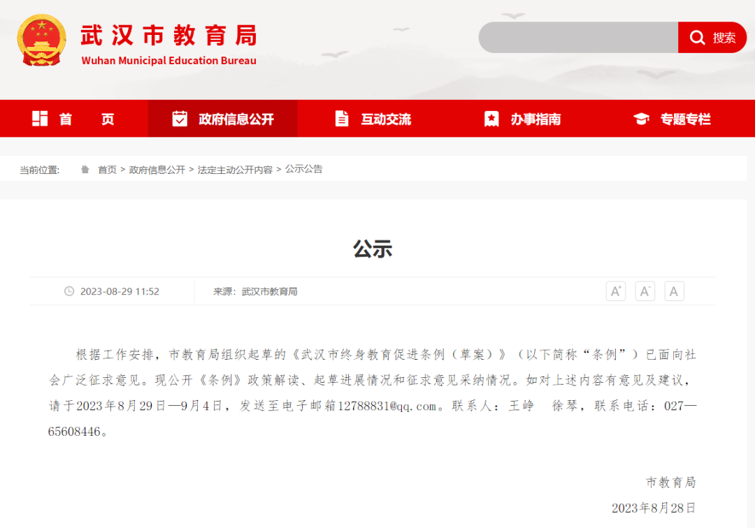 2023年2月8日,《武汉市终身教育促进条例(草案)》向社会进行公示,广泛征求社会各界意见建议,现将有关情况说明如下: