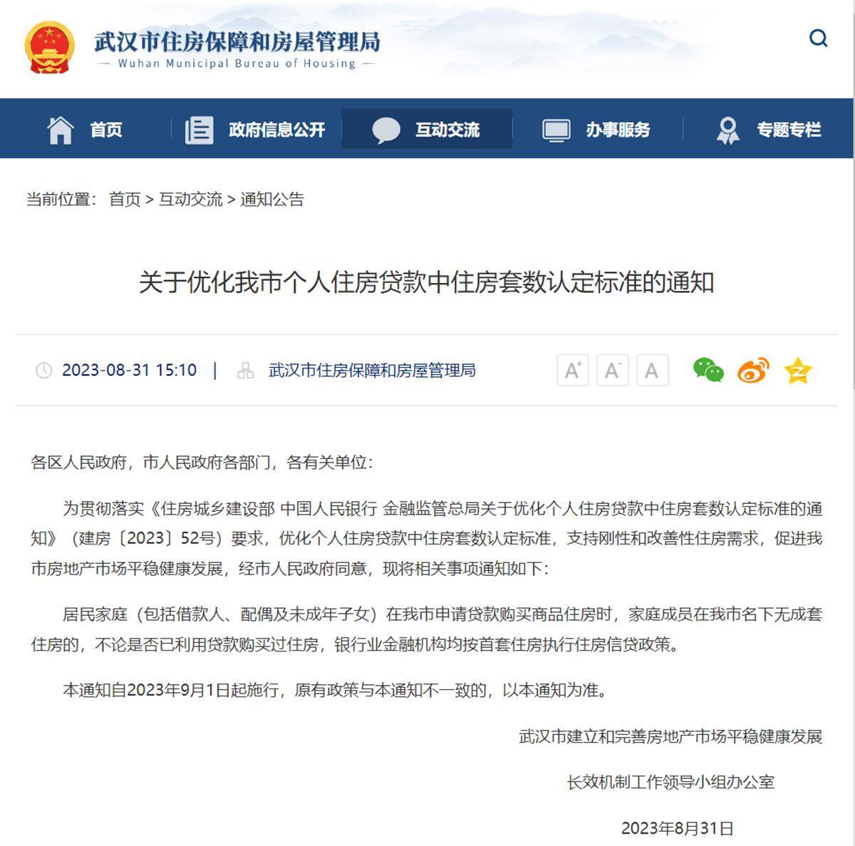 8月31日,为更好满足刚性和改善性住房需求,武汉市建立和完善房地产市场平稳健康发展长效机制工作领导小组办公室印发了《关于优化我市个人住房贷款中住房套数认定标准的通知》。通知称,居民家庭(包括借款人、配偶及未成年子女)在武汉市申请贷款购买商品住房时,家庭成员在该市名下无成套住房的,不论是否已利用贷款购买过住房,银行业金融机构均按首套住房执行住房信贷政策,自2023年9月1日起施行。