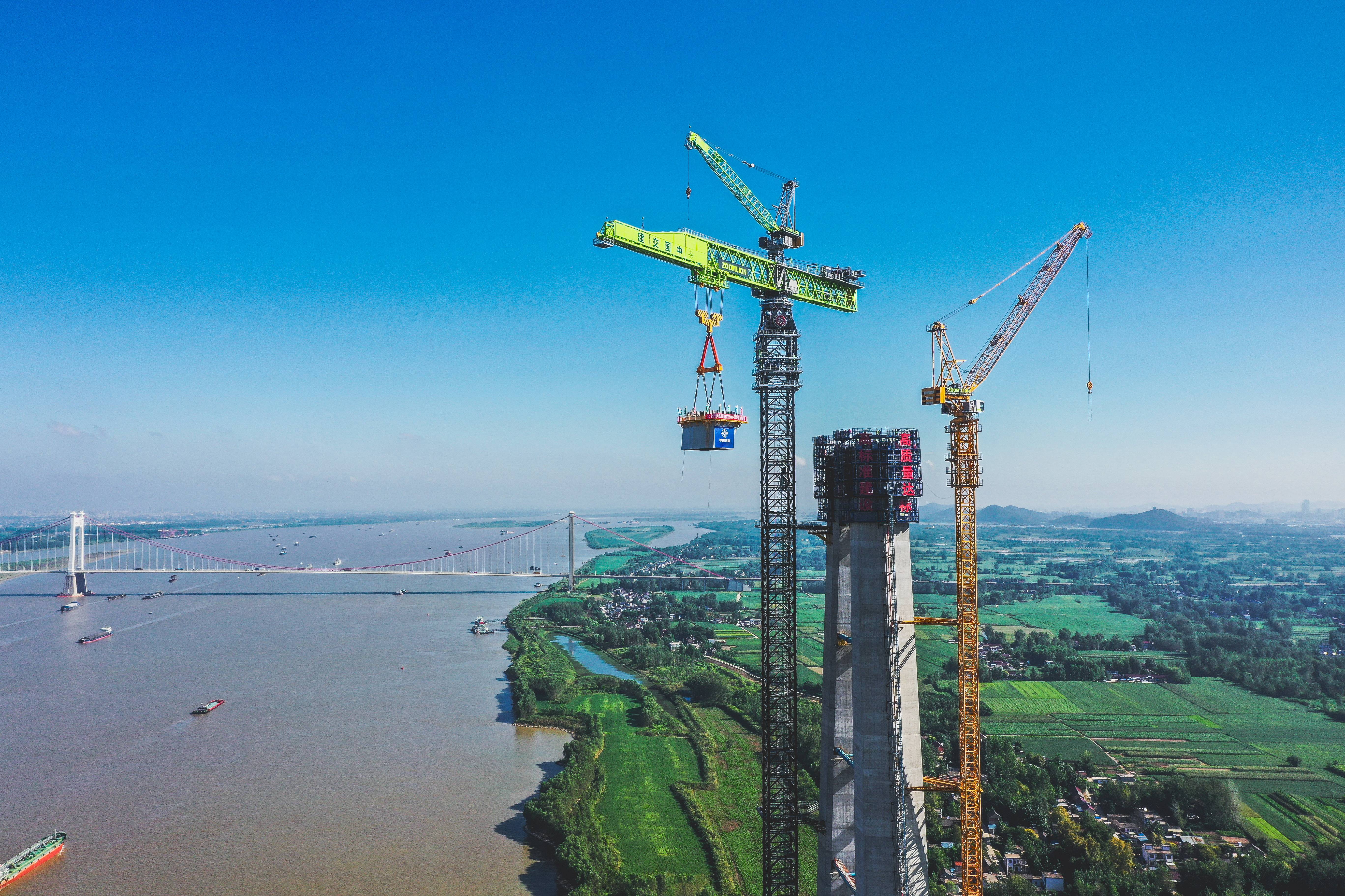 长江日报大武汉客户端9月2日讯 超级装备助力世界级桥梁建设。9月1日上午,位于安徽马鞍山当涂县江心洲的巢马城际铁路马鞍山公铁长江大桥南主塔(5号塔)施工现场,全球最大的塔式起重吊机将一节重达313吨的钢塔精准吊装对接到220.5米高空的混凝土塔柱上,标志着世界最大跨度三塔斜拉桥南主塔转入上塔柱施工阶段,也宣告这一大国重器正式投用。