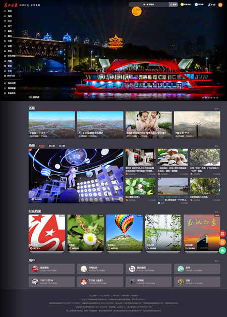此次全新升级的长江头条网页版,整体风格简约时尚,页面设计以深灰色为底色。首页设置有轮播图、话题、热榜、时光档案、用户、菜单栏等板块。菜单栏板块中,“我的”“关注”“最新”“精选”“风景”“生态”“旅游”等子栏目一目了然。