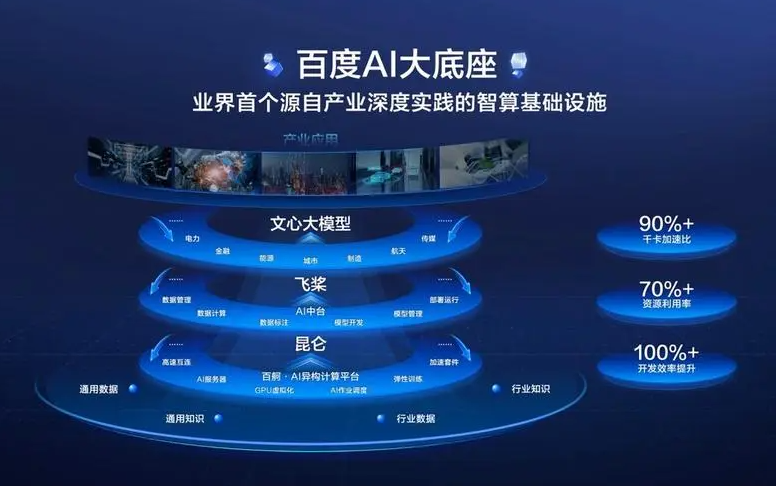 目前,百度人工智能四层框架“芯片层-框架层-模型层-应用层”:芯片可以理解为硬件技术算力;飞桨为框架层,集深度学习核心框架、基础模型库、端到端开发套件、丰富的工具组件于一体,它为文心一言及背后的大模型做支撑,结合大模型结构特色和量化技术,完成推理引擎优化版本储备;最终由各类插件连接千行百业,从而得以应用。