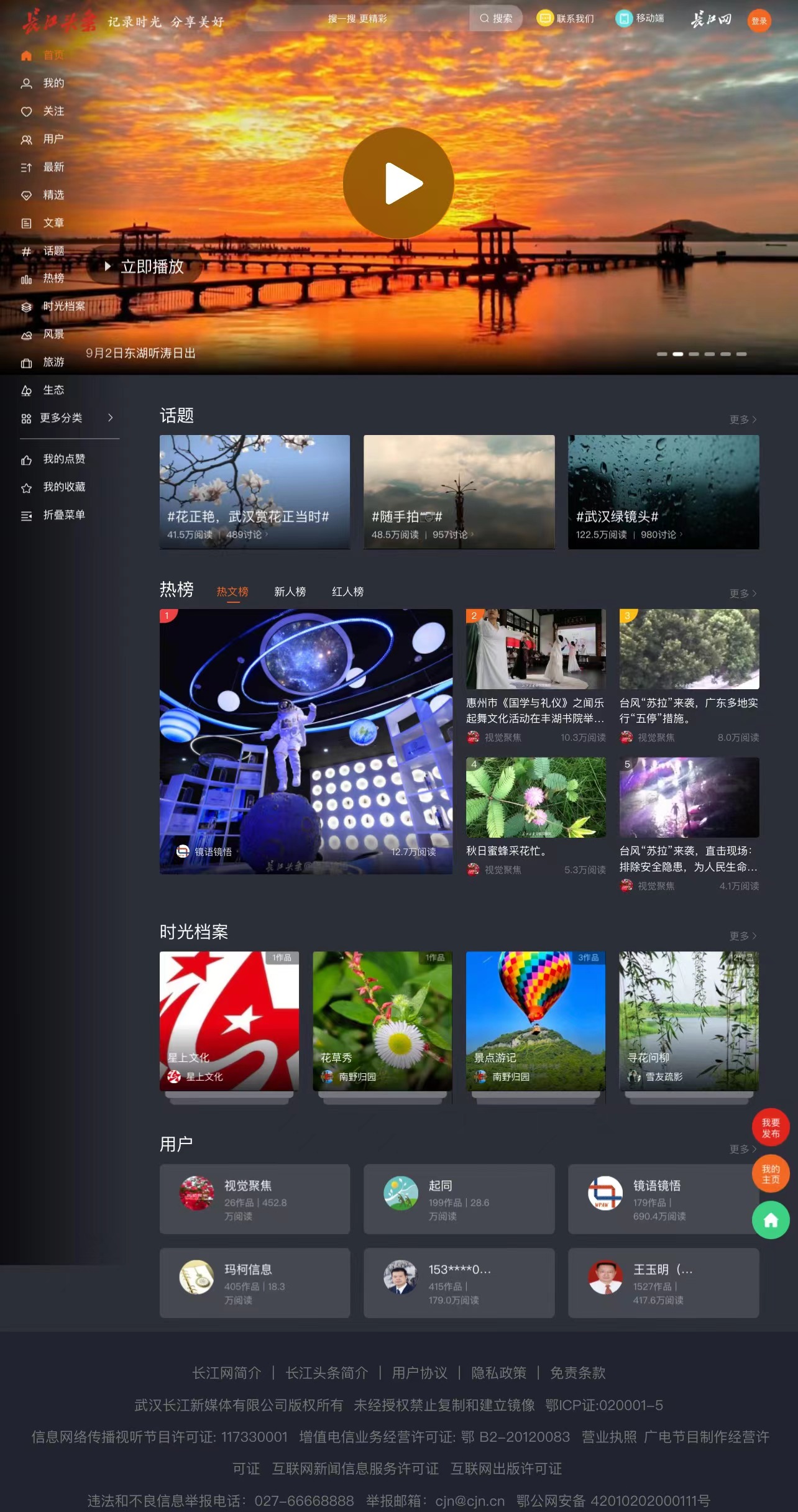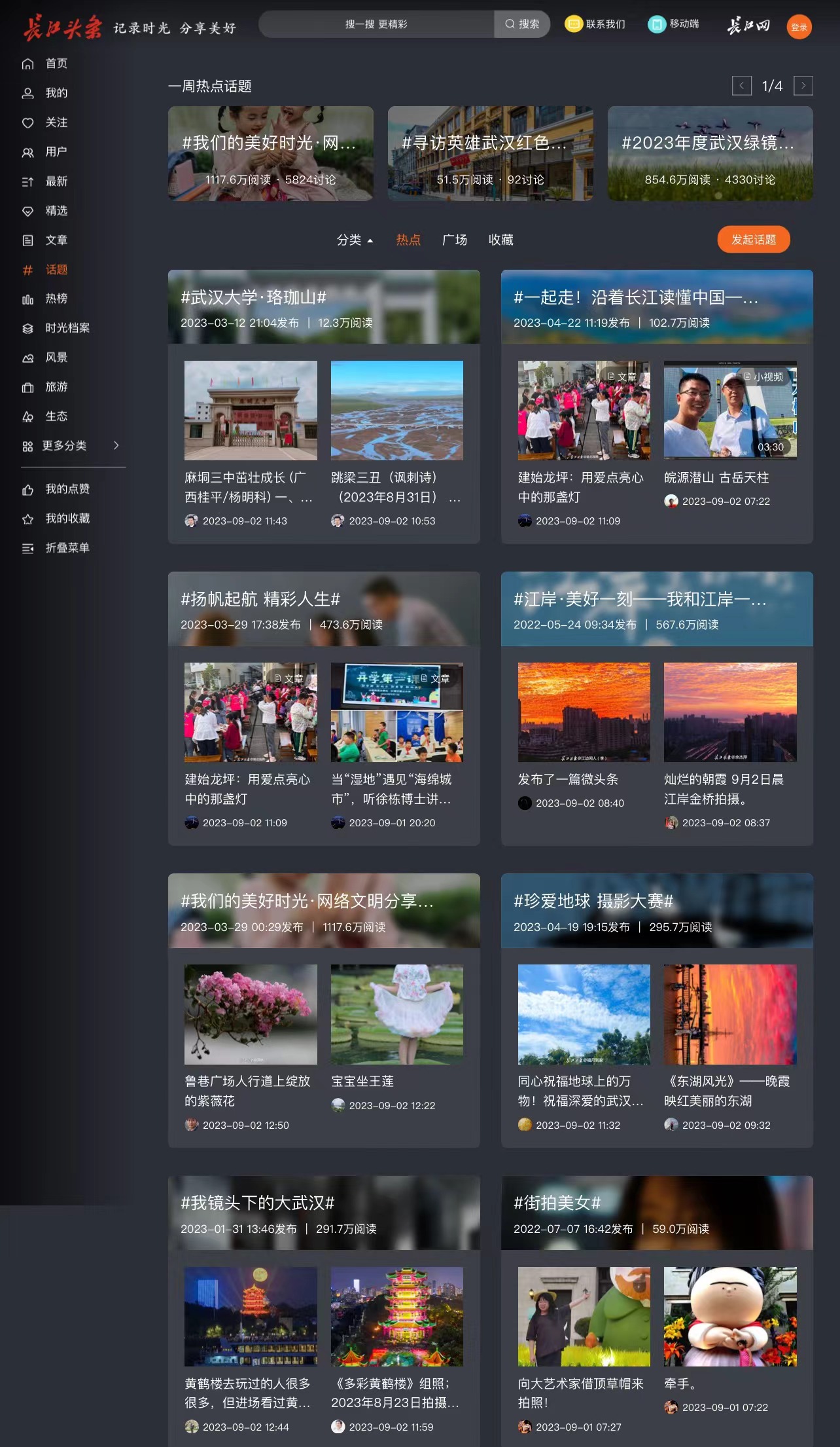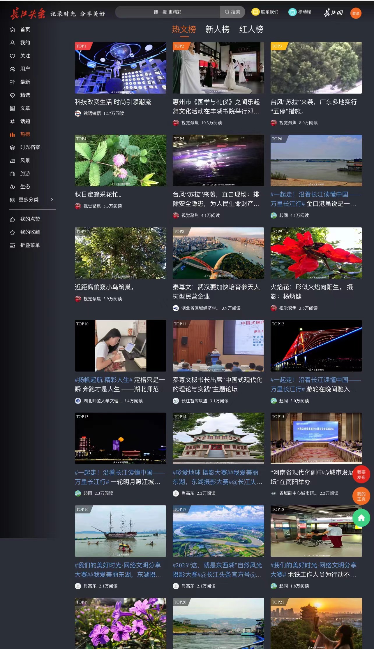 全新升级的长江头条网页版首页上,话题、热榜、时光档案、用户四大版块自上而下排列。通过放大封面图片,突出视觉表达,在容纳更多信息要素的同时,不仅提升了网页内容的可读性,还为用户带来“眼前一亮”的阅读体验。
