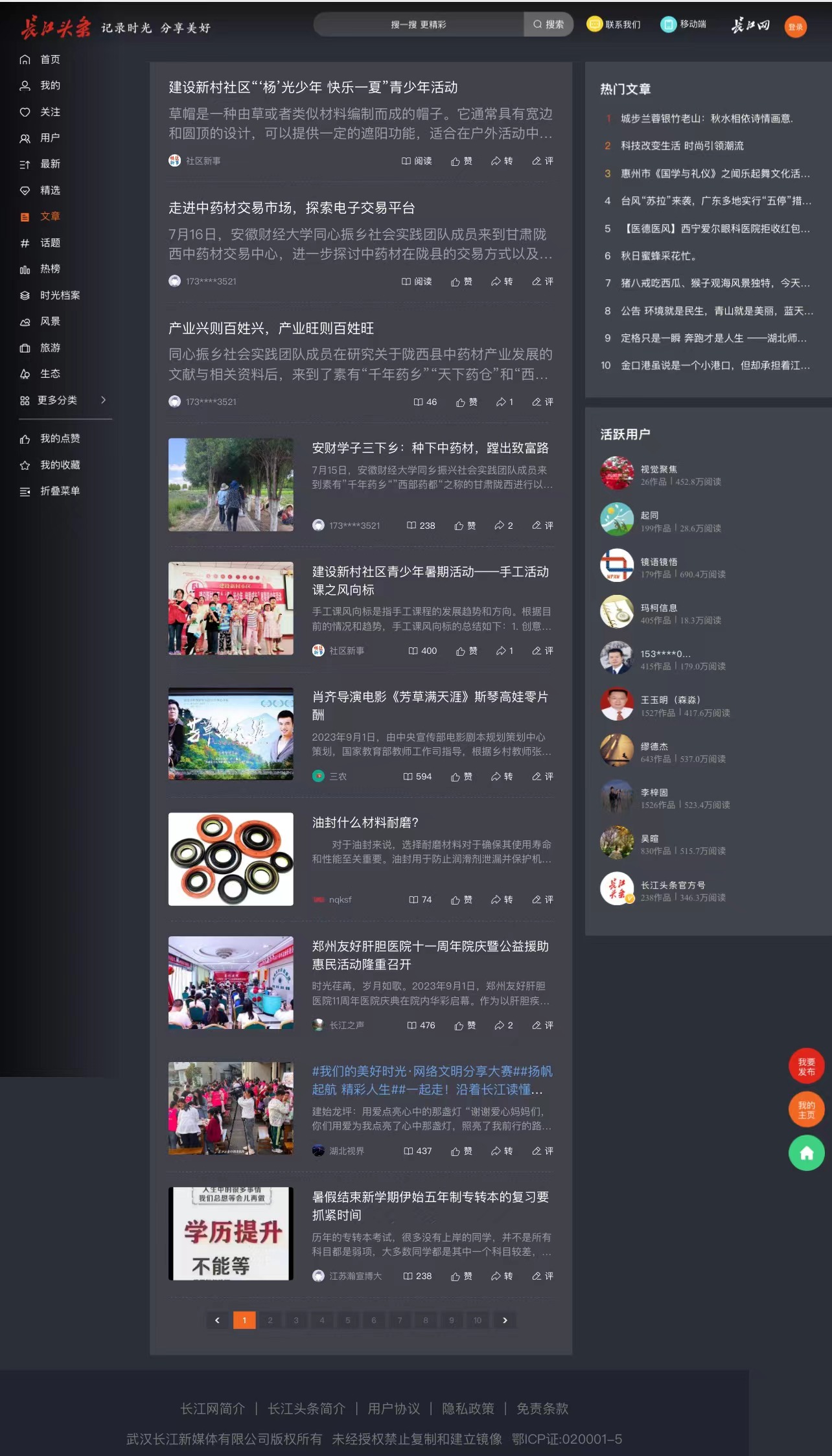 此次全新升级的长江头条网页版新增“文章”板块,集中展现用户发布的优质文章内容,为用户提供专业化、高质量的阅读体验。“这段时间,在长江头条平台看到了特别多的高校大学生分享自己进行社会实践的好文章,这让我回想起自己在大学时光,以后可以在新增的‘文章’板块看个尽兴了。”长江头条“95”后用户吴雨伦说。