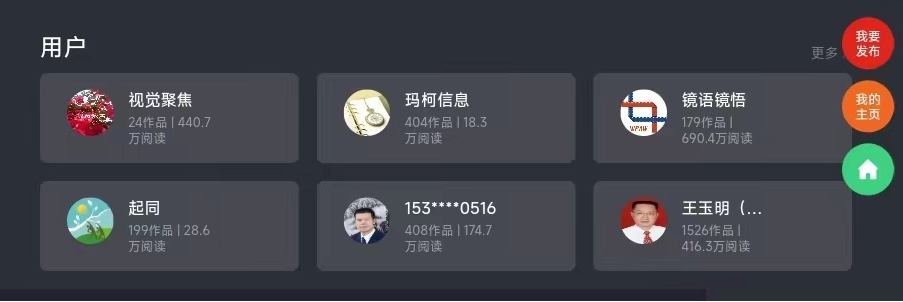 “红绿灯”悬浮按钮中,红色圆灯为“我要发布”功能键,黄色圆灯为“我的主页”功能键,绿色圆灯为“返回主页”功能键。