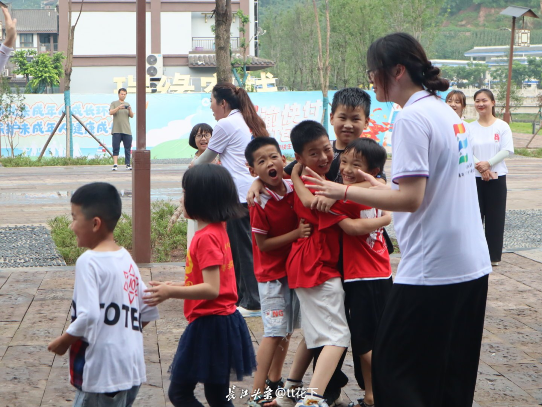 重庆对外经贸学院“以文载梦,借艺创和”文明城区促进实践团成员在重庆市丰都县三建乡未成年人保护工作站带孩子们玩游戏。长江头条用户@tt花下 供图