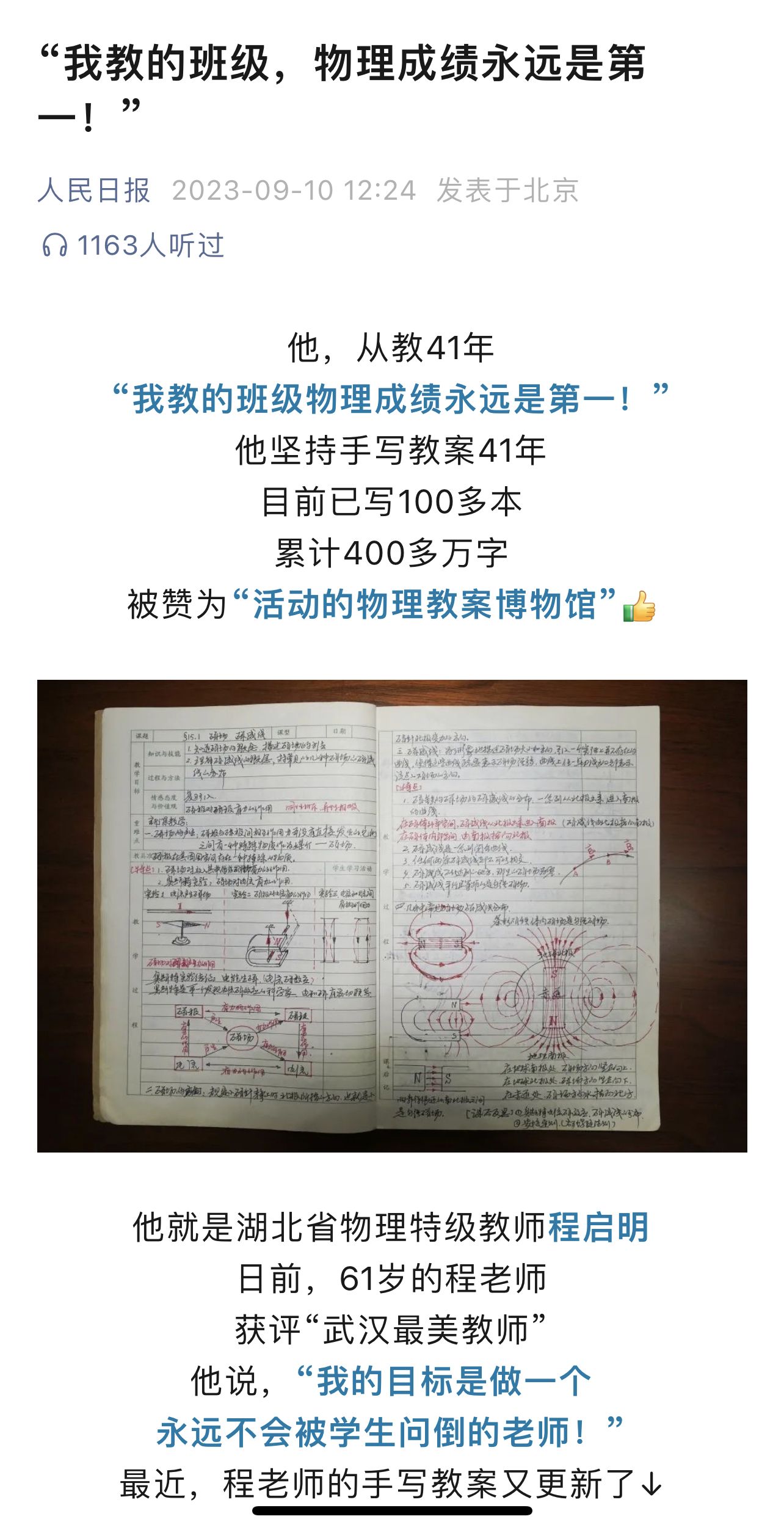 他,从教41年,“我教的班级物理成绩永远是第一”;他,坚持手写教案41年目前已写100多本,累计400多万字。“我的目标是做一个永远不会被学生问倒的老师!”今年教师节,61岁的武汉市东湖中学物理教师程启明获评武汉“最美教师”。