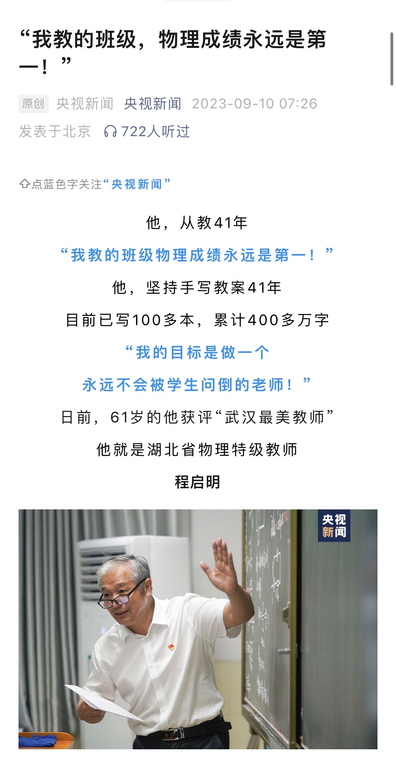 在9月10日的报道中,央视新闻、人民日报等媒体聚焦了程启明老师撰写教案的过程和体会——“写教案前,他要把上一年度的课本、参考书中的知识点看一遍,然后针对本班学生的基本特点,形成今年的新教案。课后,他要反思有没有需要改进、加强的地方,有没有值得更新的地方,并把这些内容写在教学反思中。下一轮备课时,他要补充完善上一轮备课中不足的内容,这样教案和教学水平就会在原有基础上不断进步。”