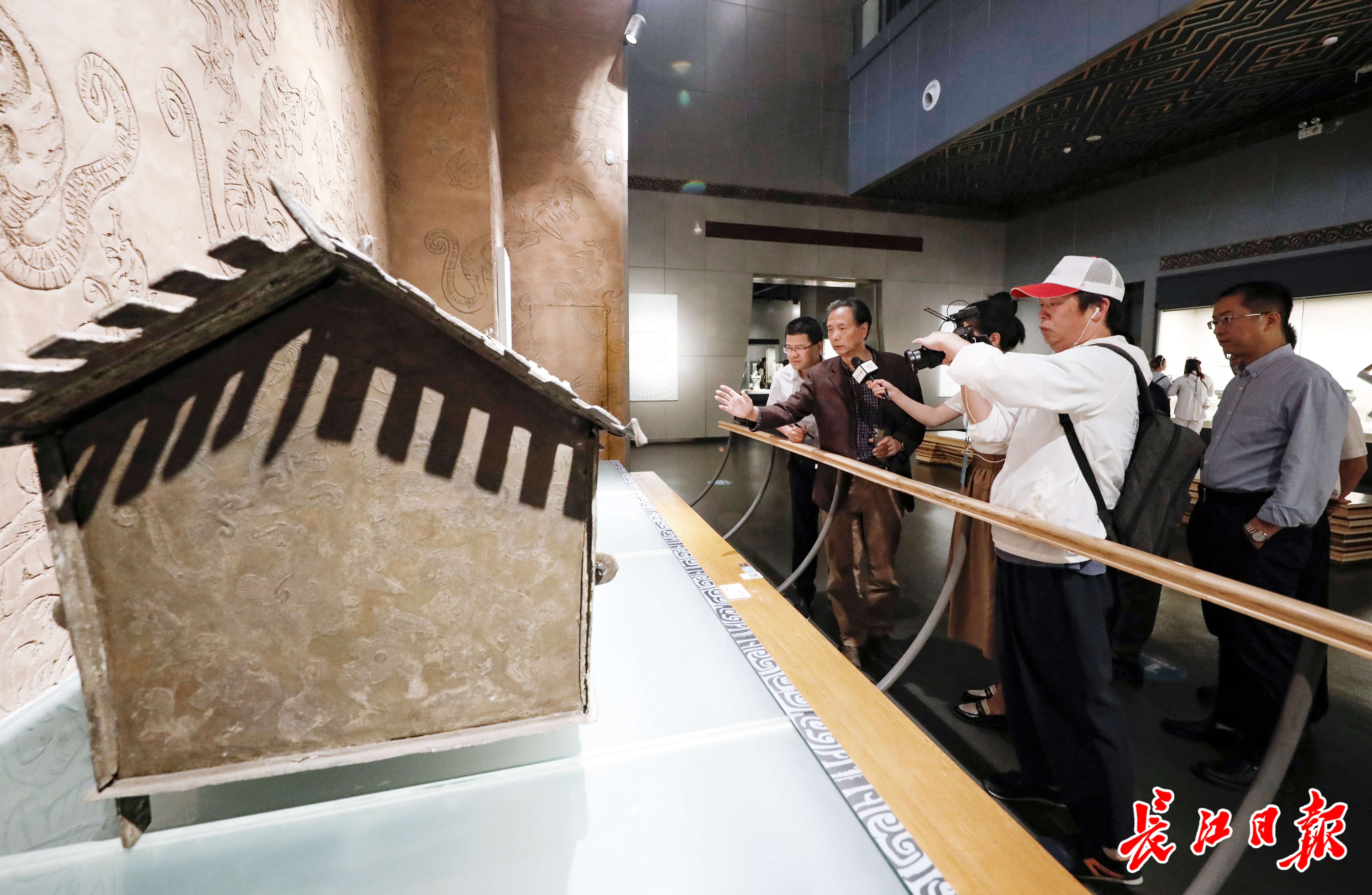 郑晓云教授介绍,铜棺外壁的回纹图案,又被称为回字纹,最初常见于新石器时代的彩陶器和商周青铜时代的青铜器上。“楚人钟爱这种由古代陶器和青铜器上的雷纹衍化来的几何纹样,其简朴凝练的风格使得青铜器祭祀利器更具有恒久、庄严、厚重的感觉。”