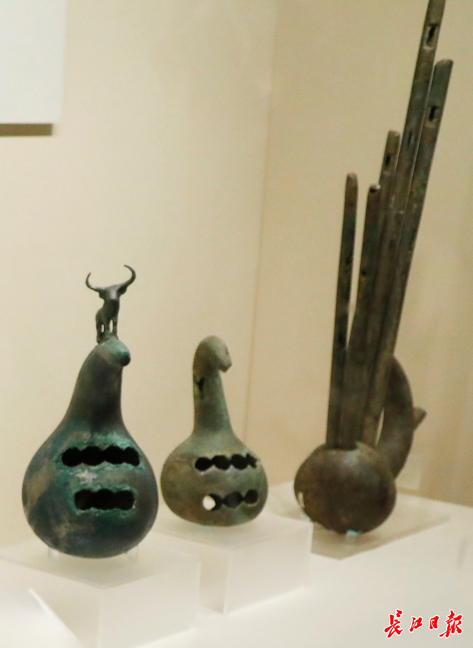 云南省博物馆副馆长、研究馆员樊海涛介绍,早在商周时期,我国古代乐器八音分类中就有用葫芦制作的匏类乐器——笙,西南少数民族使用的葫芦笙,由中原传入的笙改良而成。从湖北随县曾侯乙墓出土的几支战国初期的笙,充分证明了这一点,而在春秋晚期的湖北当阳曹家岗楚墓出土的2件残笙斗是我国发现最早的葫芦笙实物。