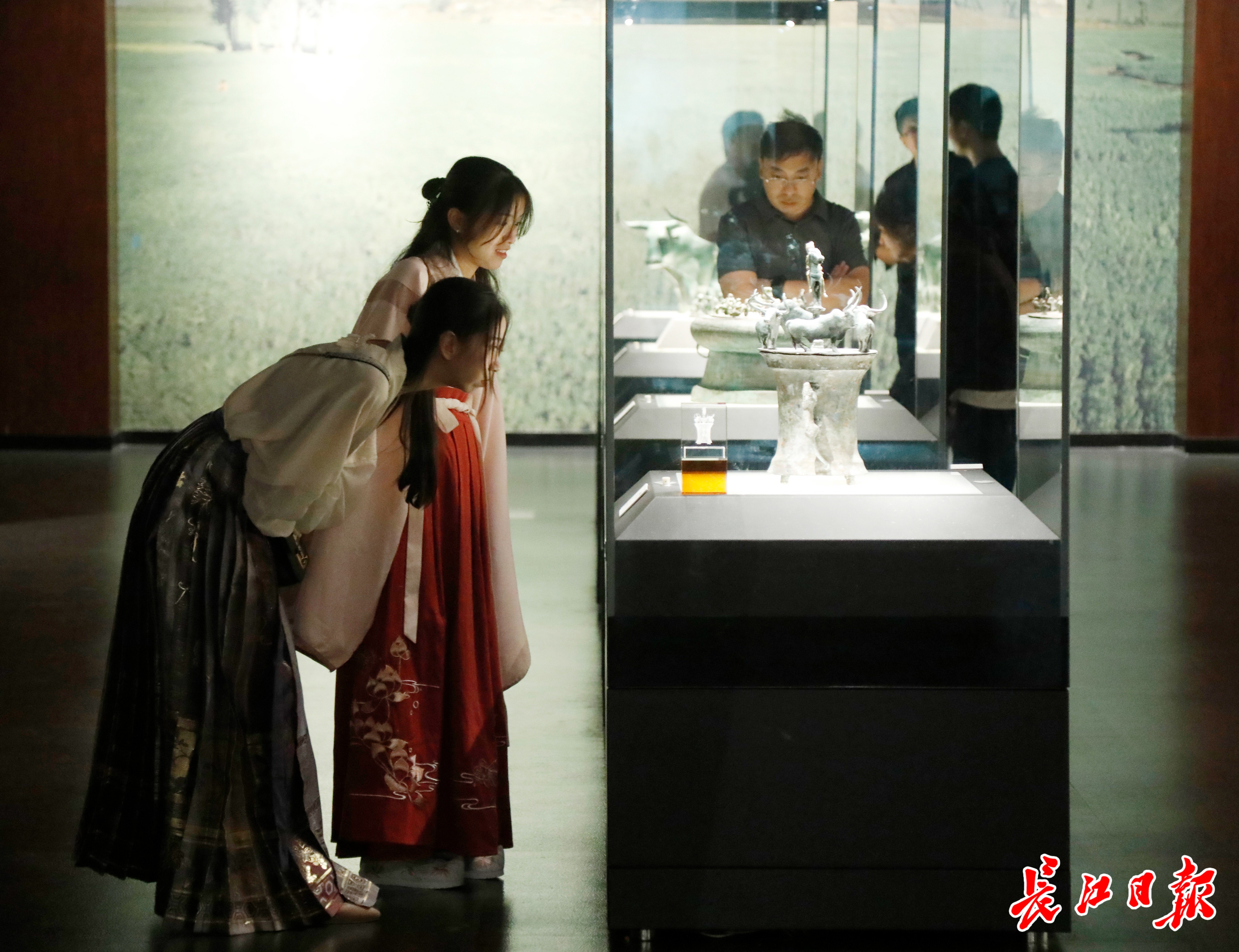 9月6日,身着汉服的青年游客在云南省博物馆内陈列有古滇国青铜器展台前仔细观看文物。 王筝 摄
