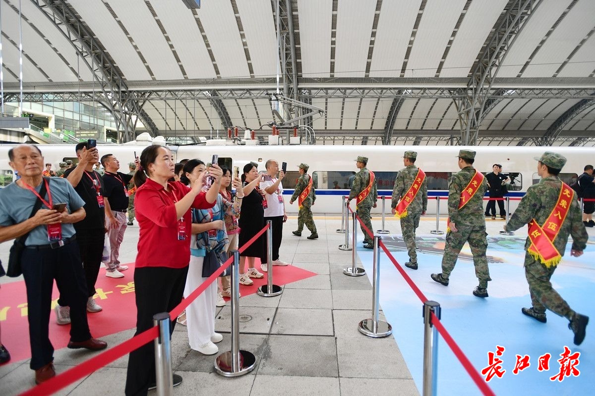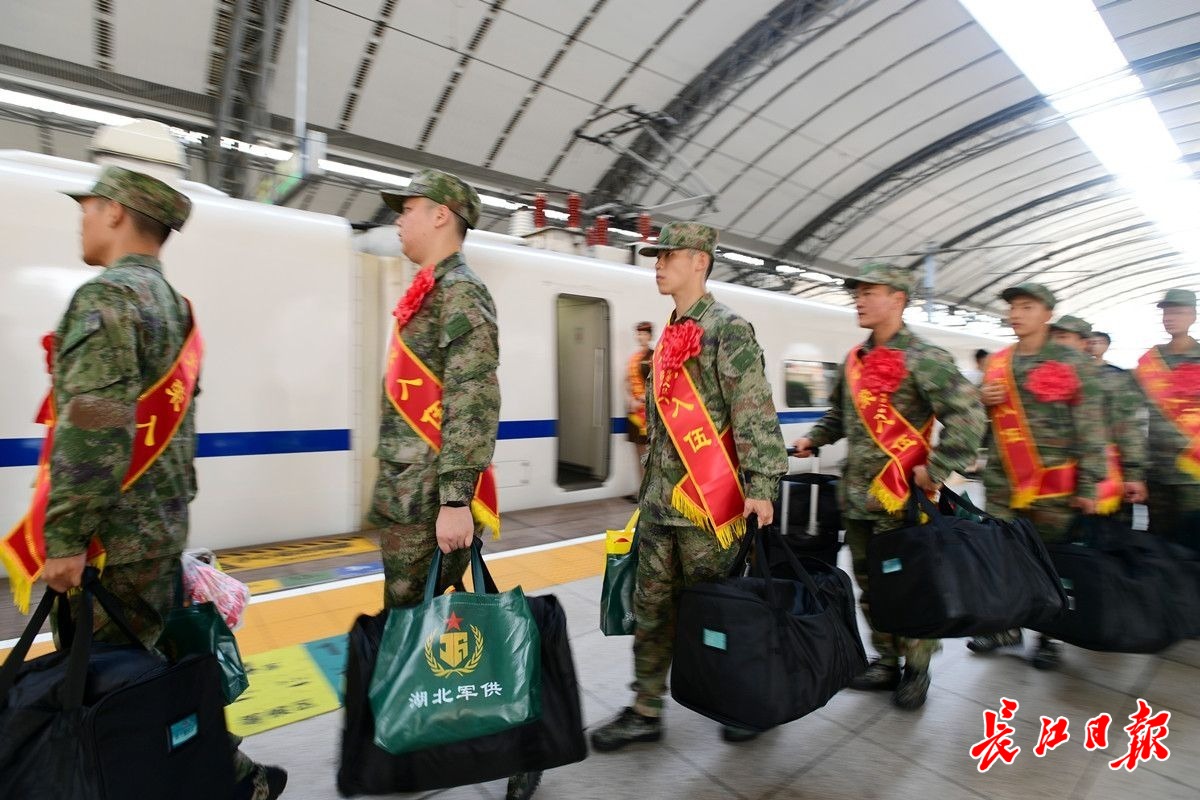 长江日报记者在现场看到,身披写有“光荣入伍”大字绶带、胸戴大红花的新兵们个个精神抖擞,人人朝气蓬勃。当天,这些新兵们排着整齐的队伍进入火车站后,立即成了火车站里最亮丽的风景线。不断有市民把真诚的祝福语送给他们,让他们感到无比自豪。
