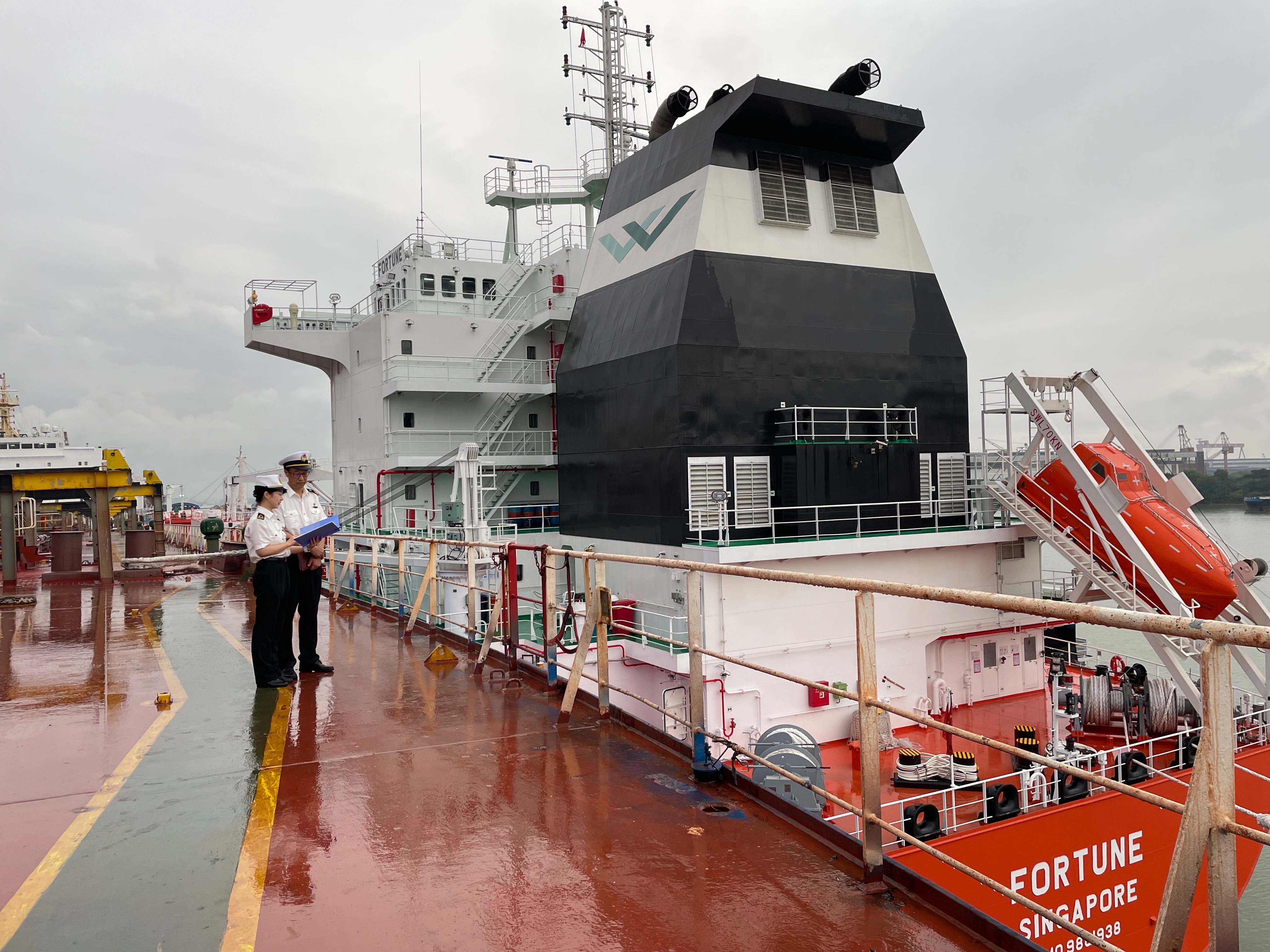 武汉海关关员对出口船舶进行现场监管。通讯员李咏 摄