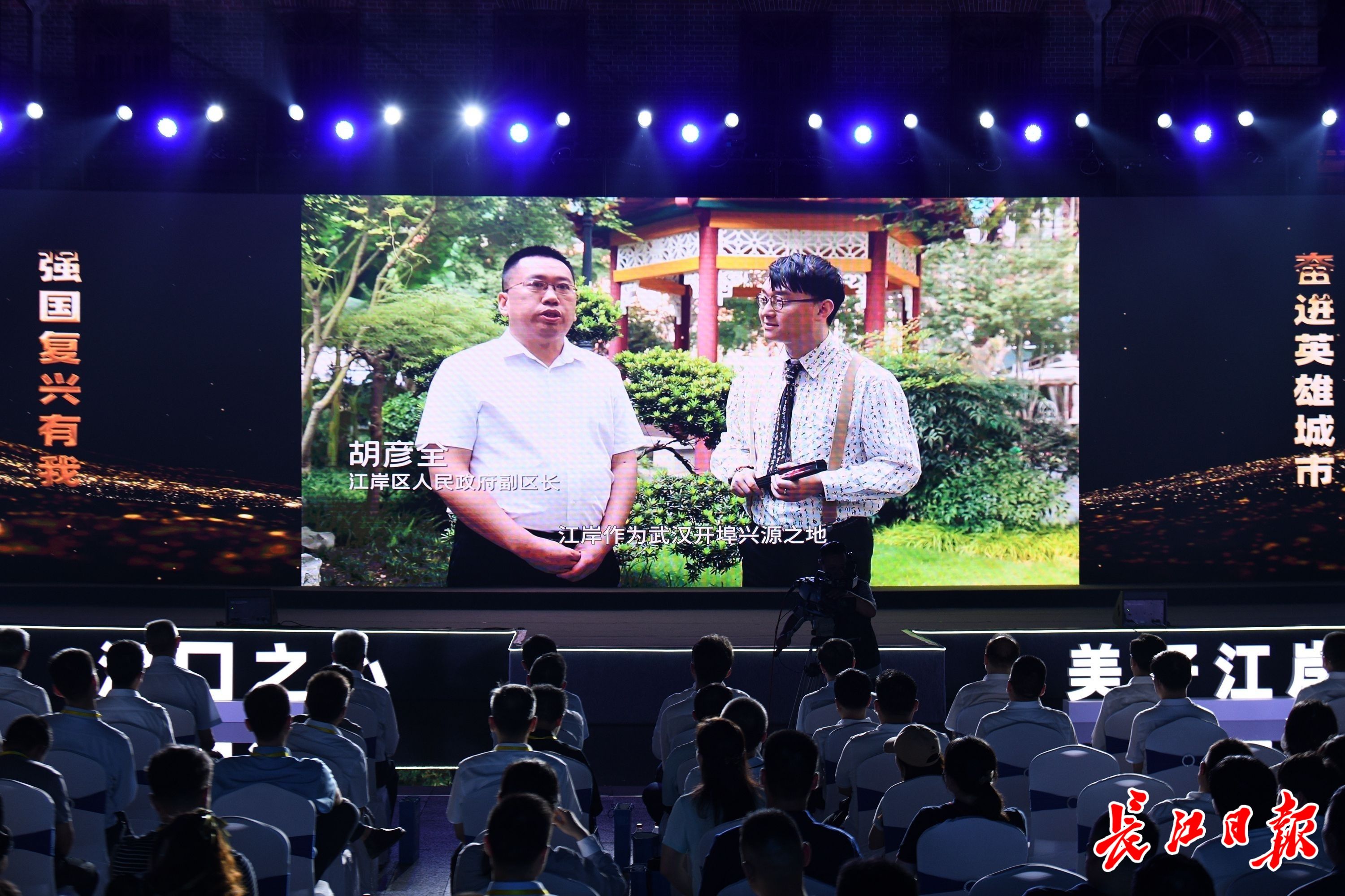 9月15日晚,“英雄城市新征程”系列形势政策报告会第三场江岸区专场举行,江岸区人民政府副区长胡彦全(左)在珞珈山街的珞园,通过视频为现场观众讲述江岸区“老城新生”的故事。长江网记者吕诗文 摄