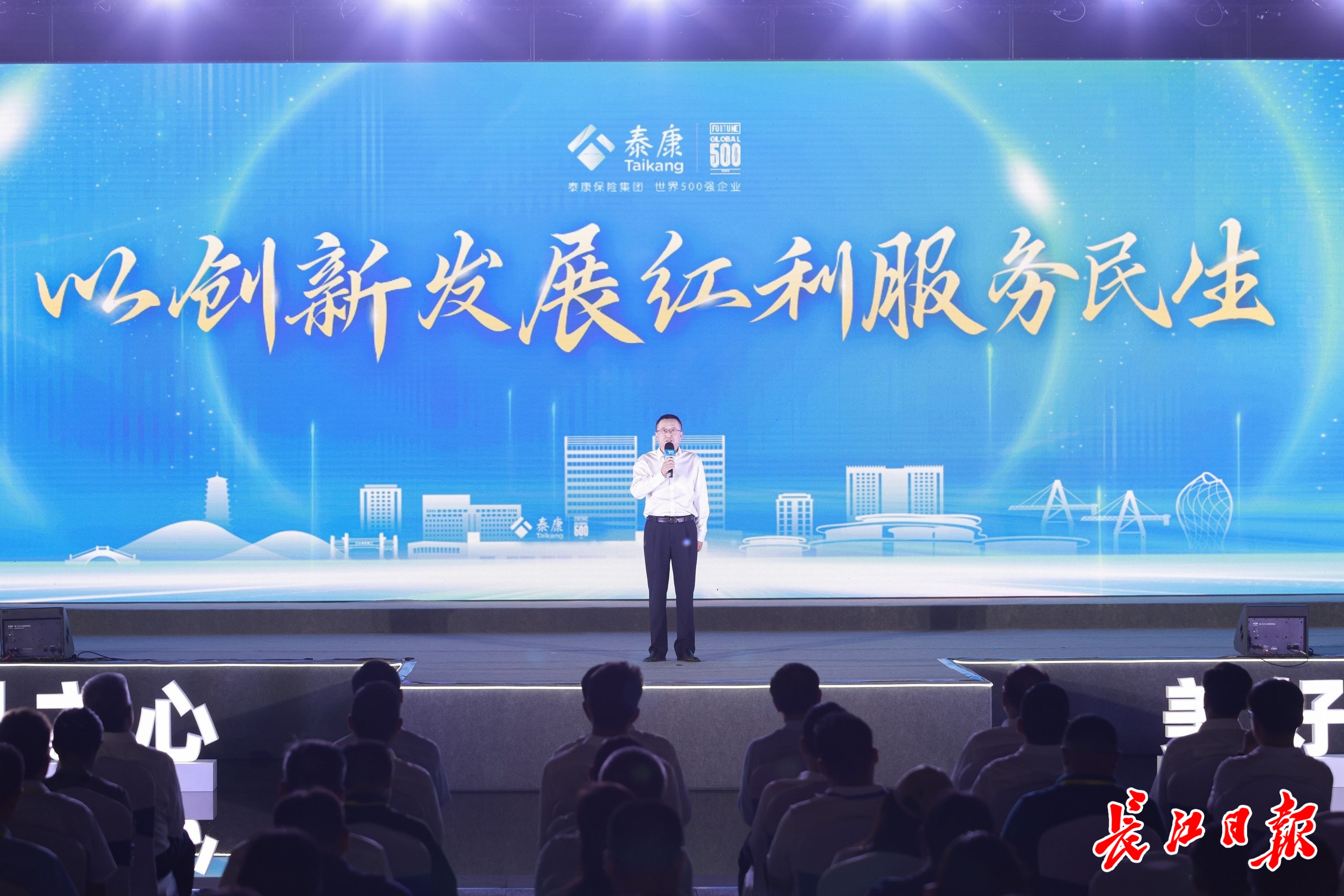 泰康保险集团副总裁、泰康在线财产保险股份有限公司党委书记、总裁李朝晖现场作报告。长江日报记者胡冬冬 摄