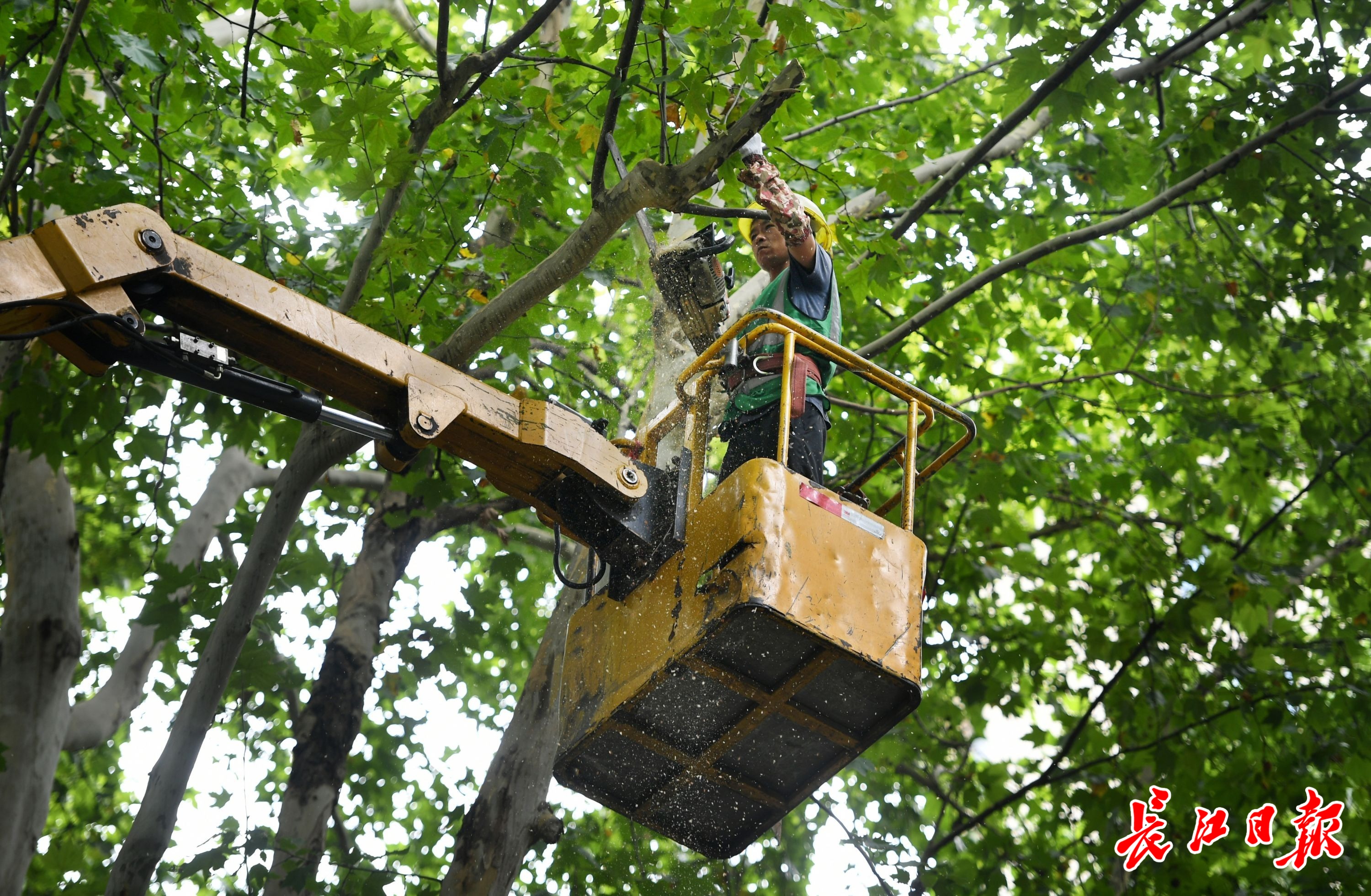江岸区园林人为惠中社区修剪大树。长江日报记者 李子云 摄