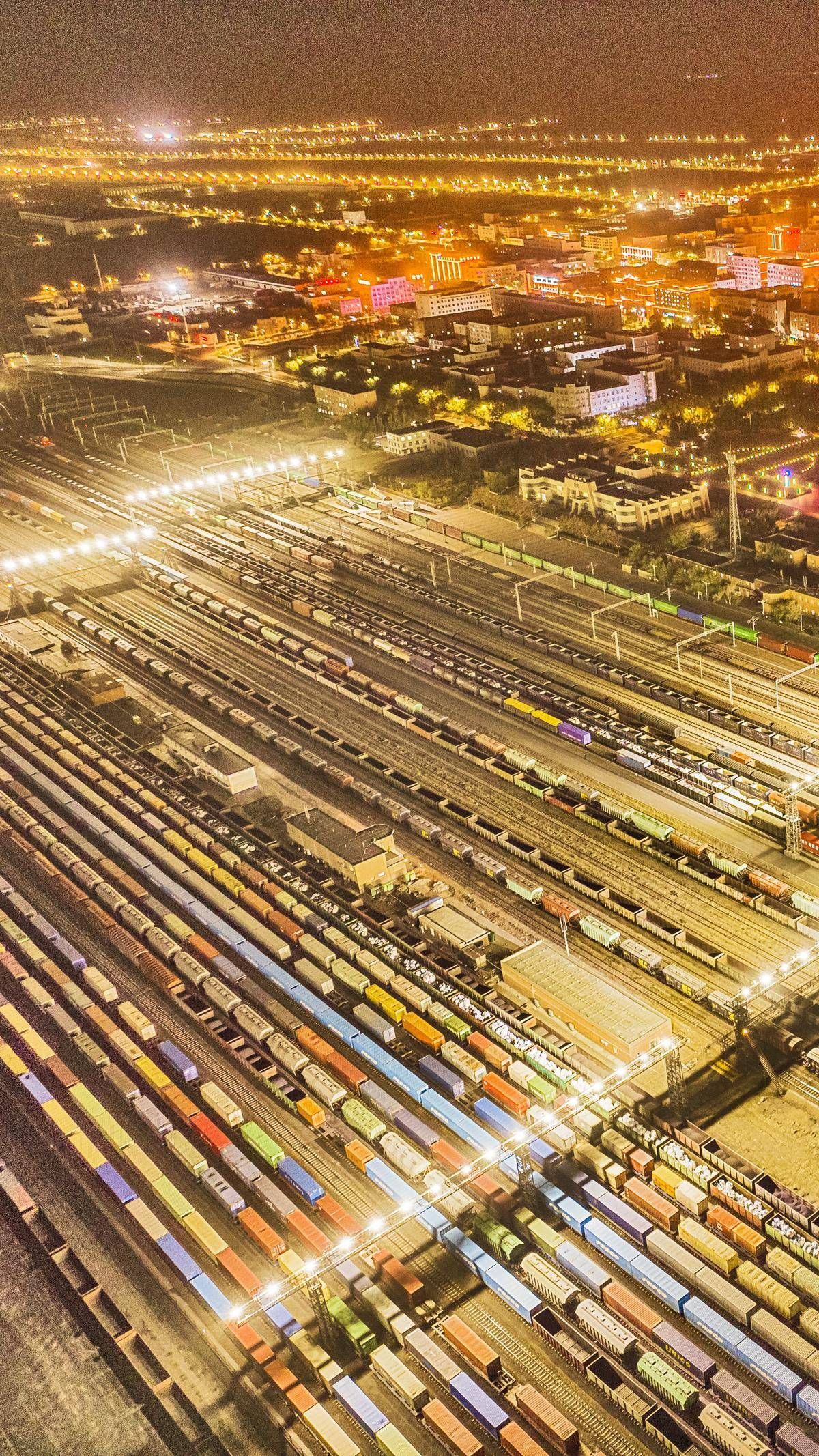 9月13日晚,阿拉山口站集装箱换装作业,满载集装箱的中欧班列正在紧张有序换装。中方使用的是标准轨,哈萨克斯坦等国家使用的是国际宽轨。因为轨距不同,中欧班列在出入境时,需在这里为货物进行换装作业。